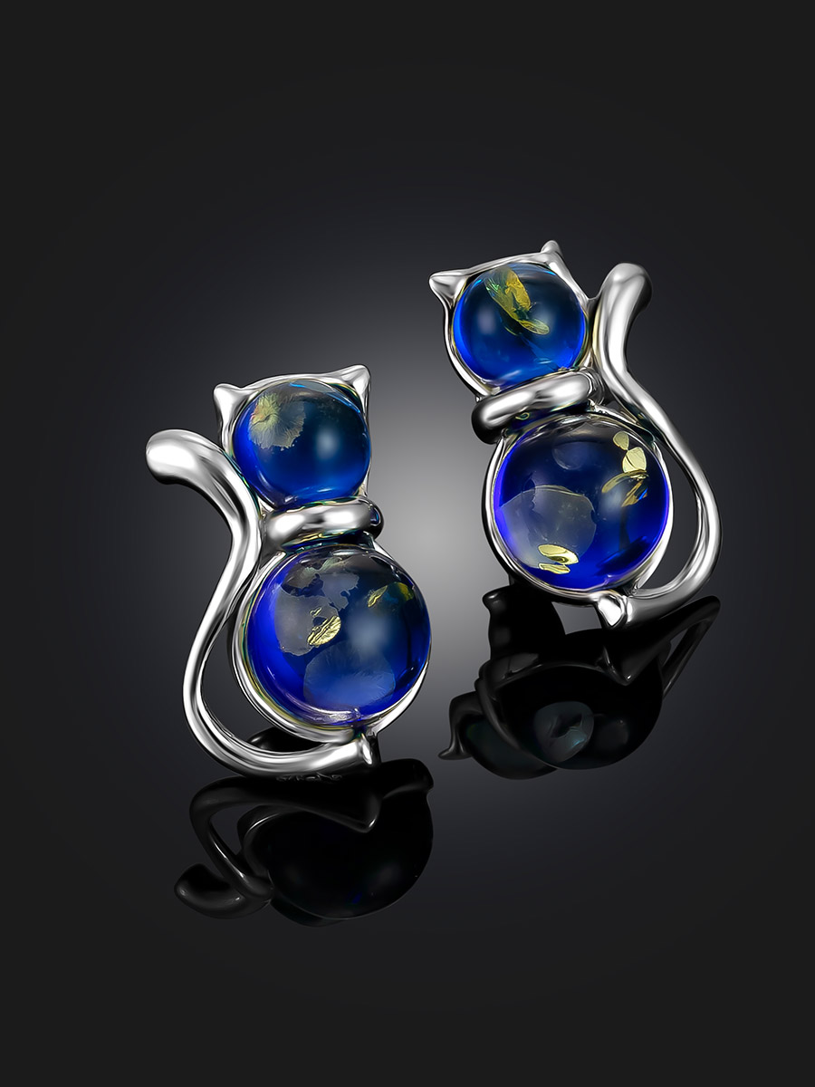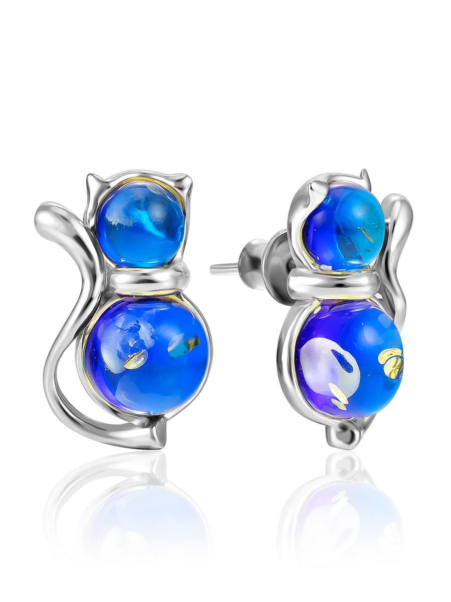 Очаровательные серьги-гвоздики «Кошечка» с ярко-синим янтарём