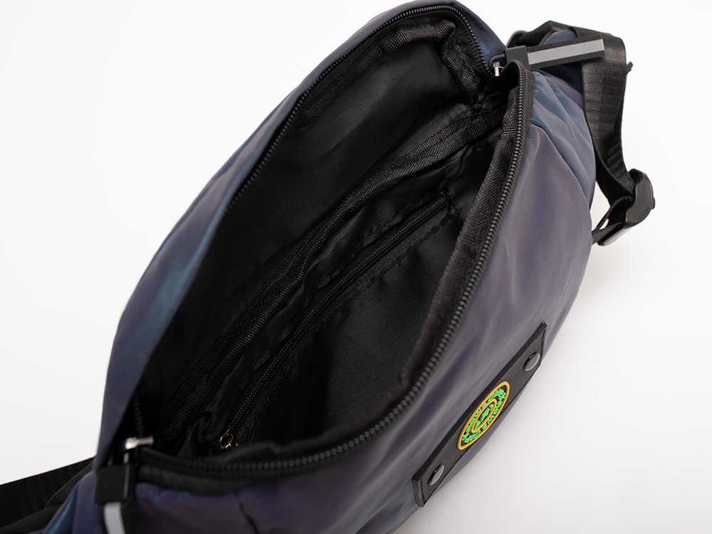 сделан кармашек на молнии. Аксессуар изготовлен из плотного, рефлективного материала,