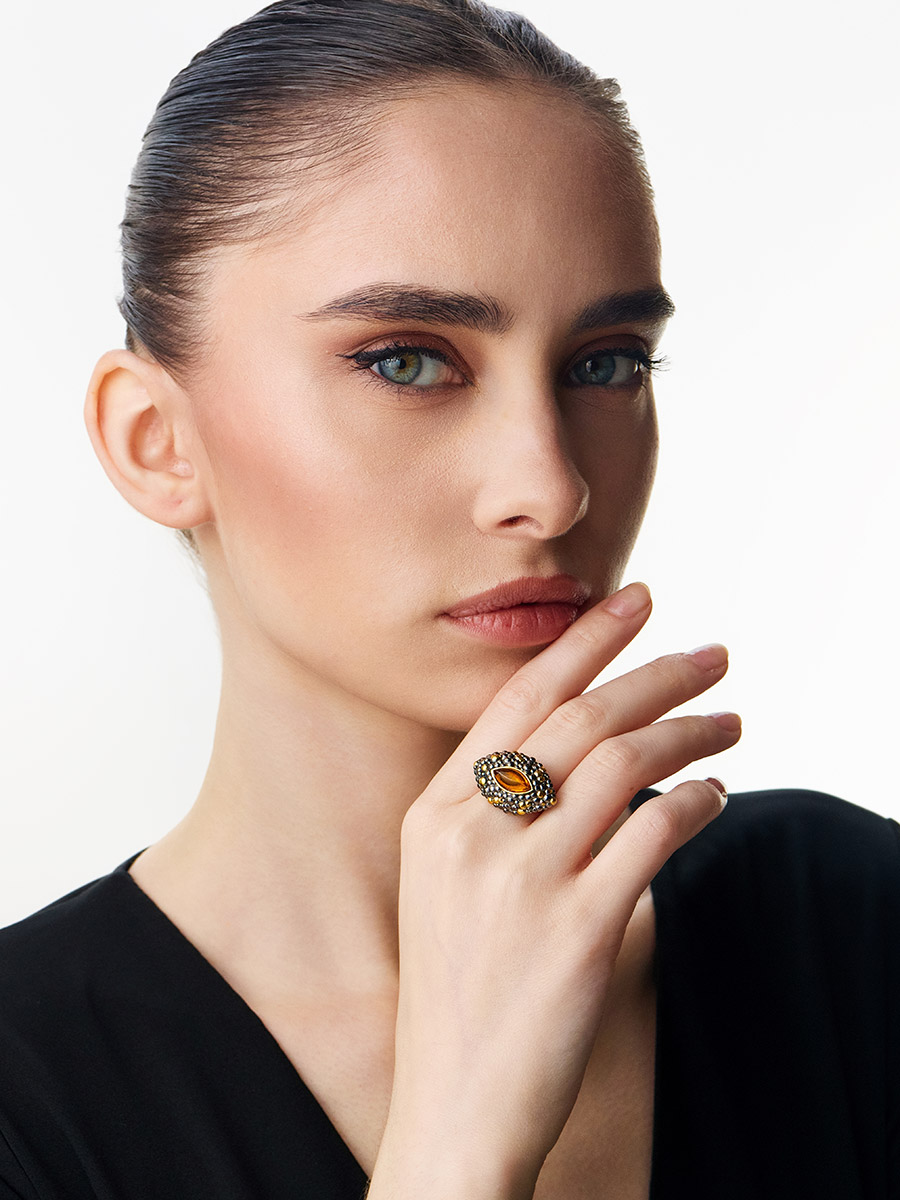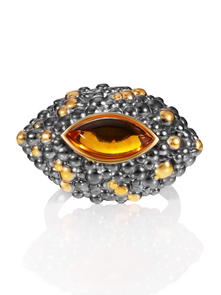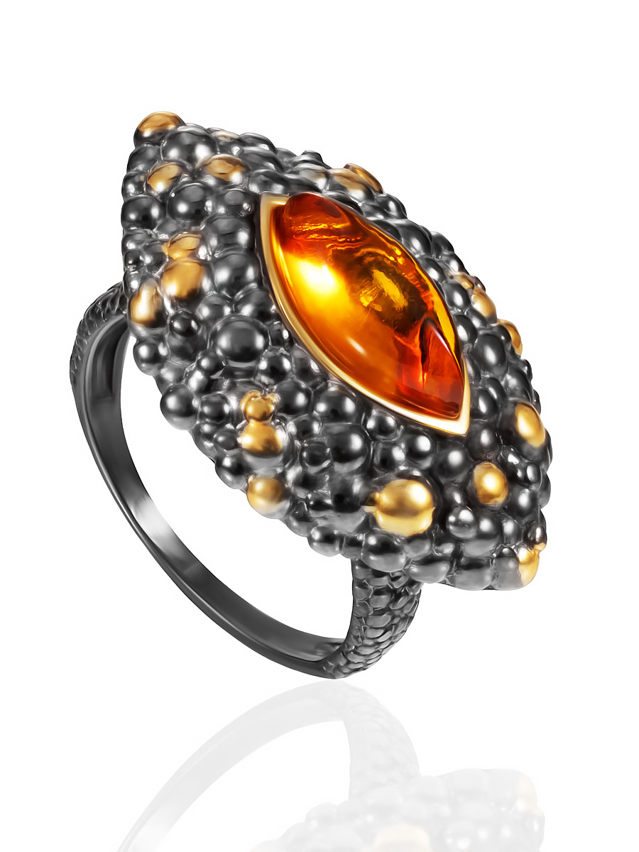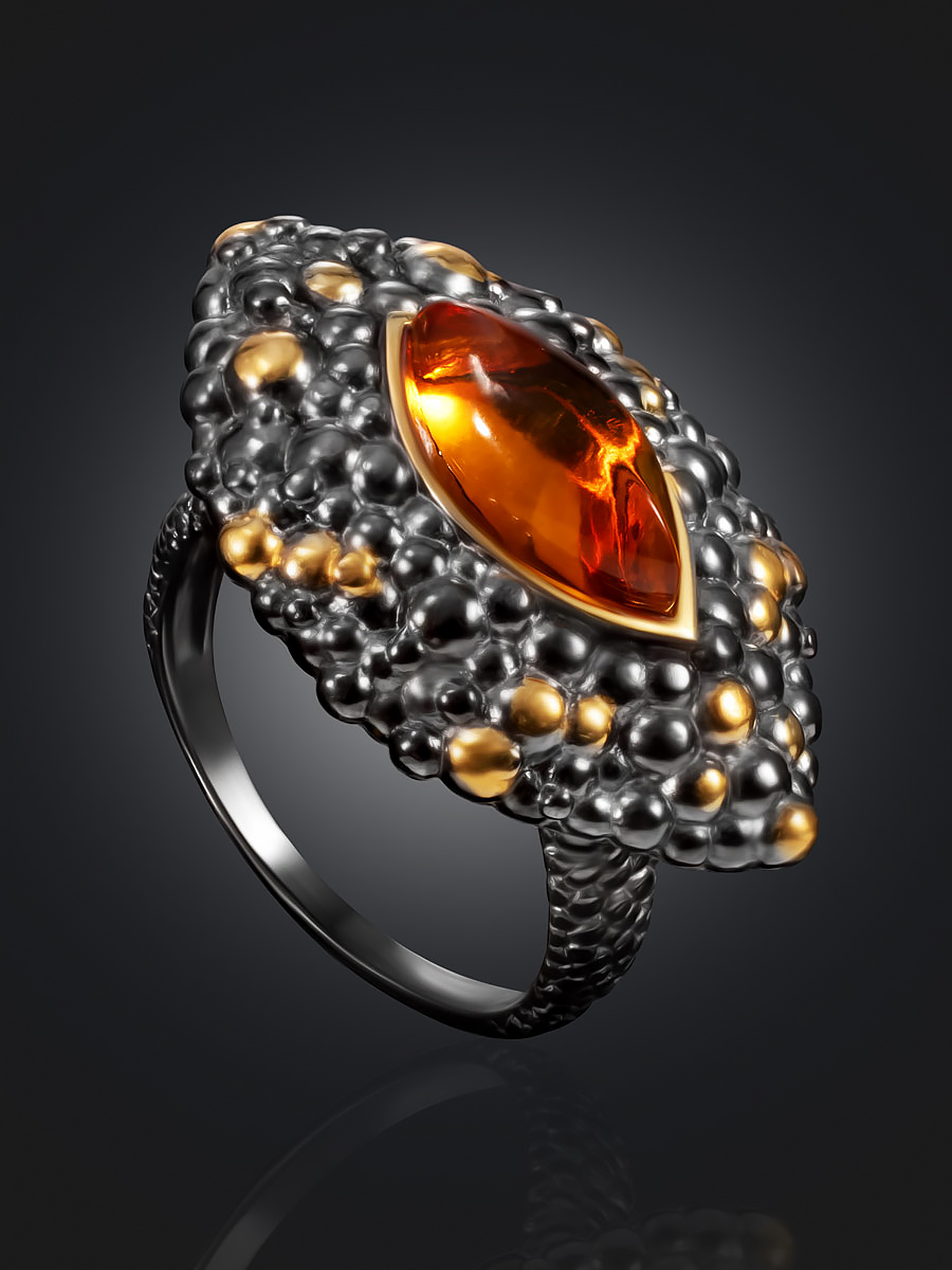 Оригинальное и необычное кольцо «Раушен» с коньячным янтарём
