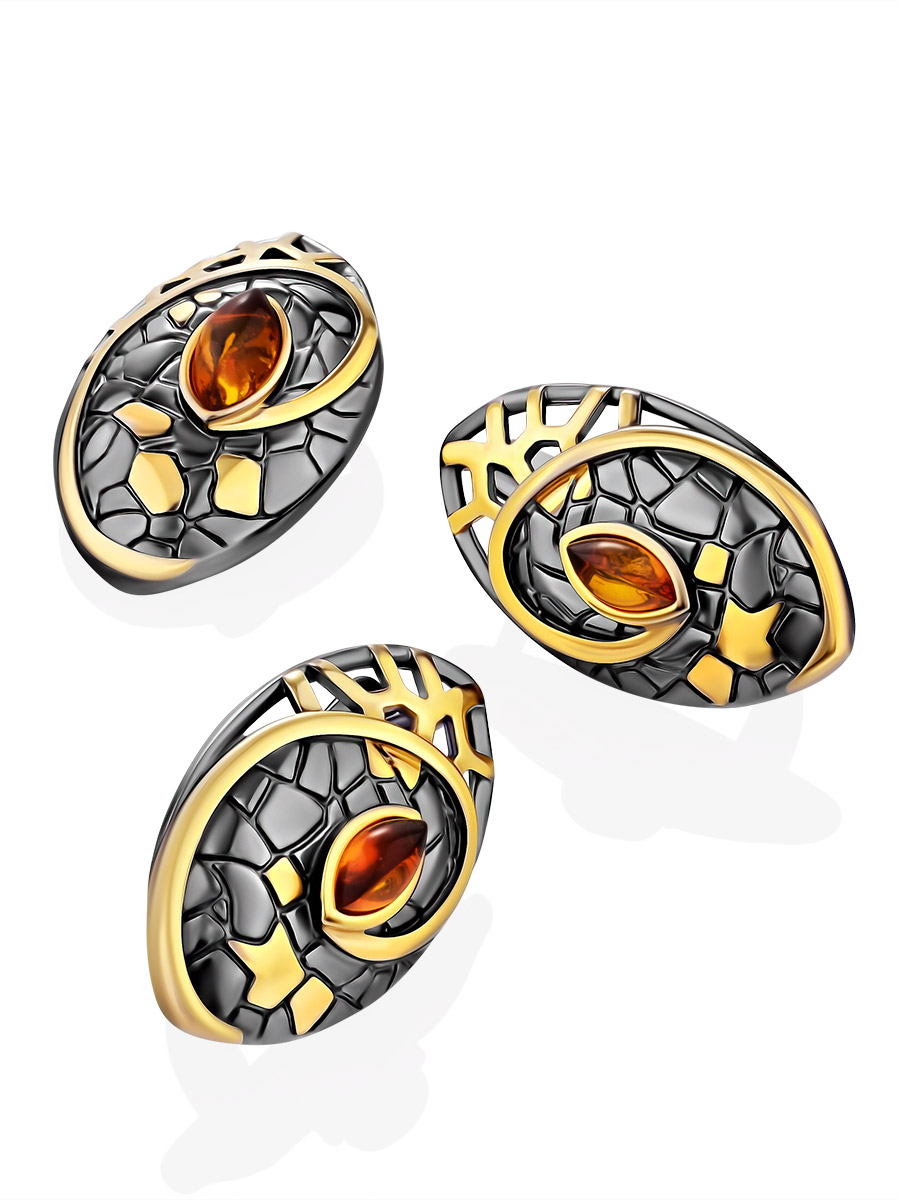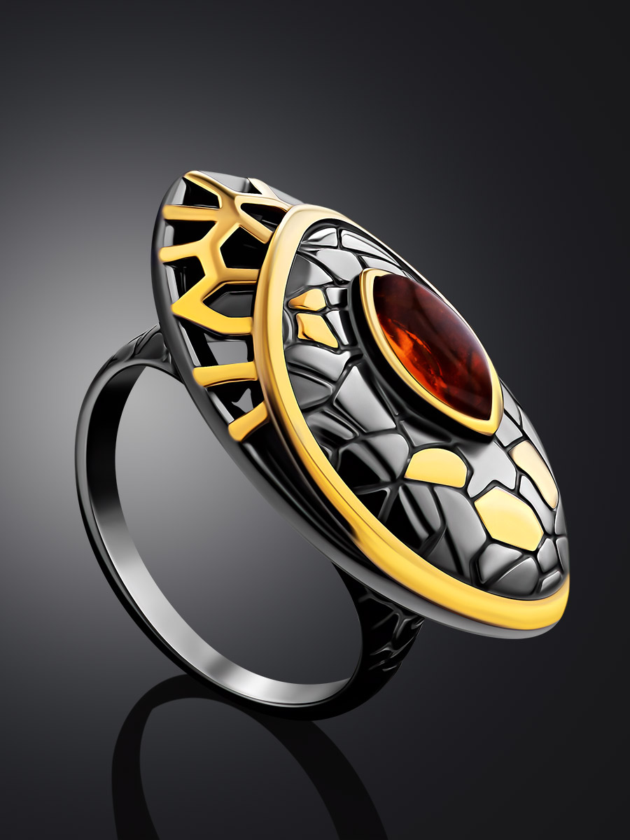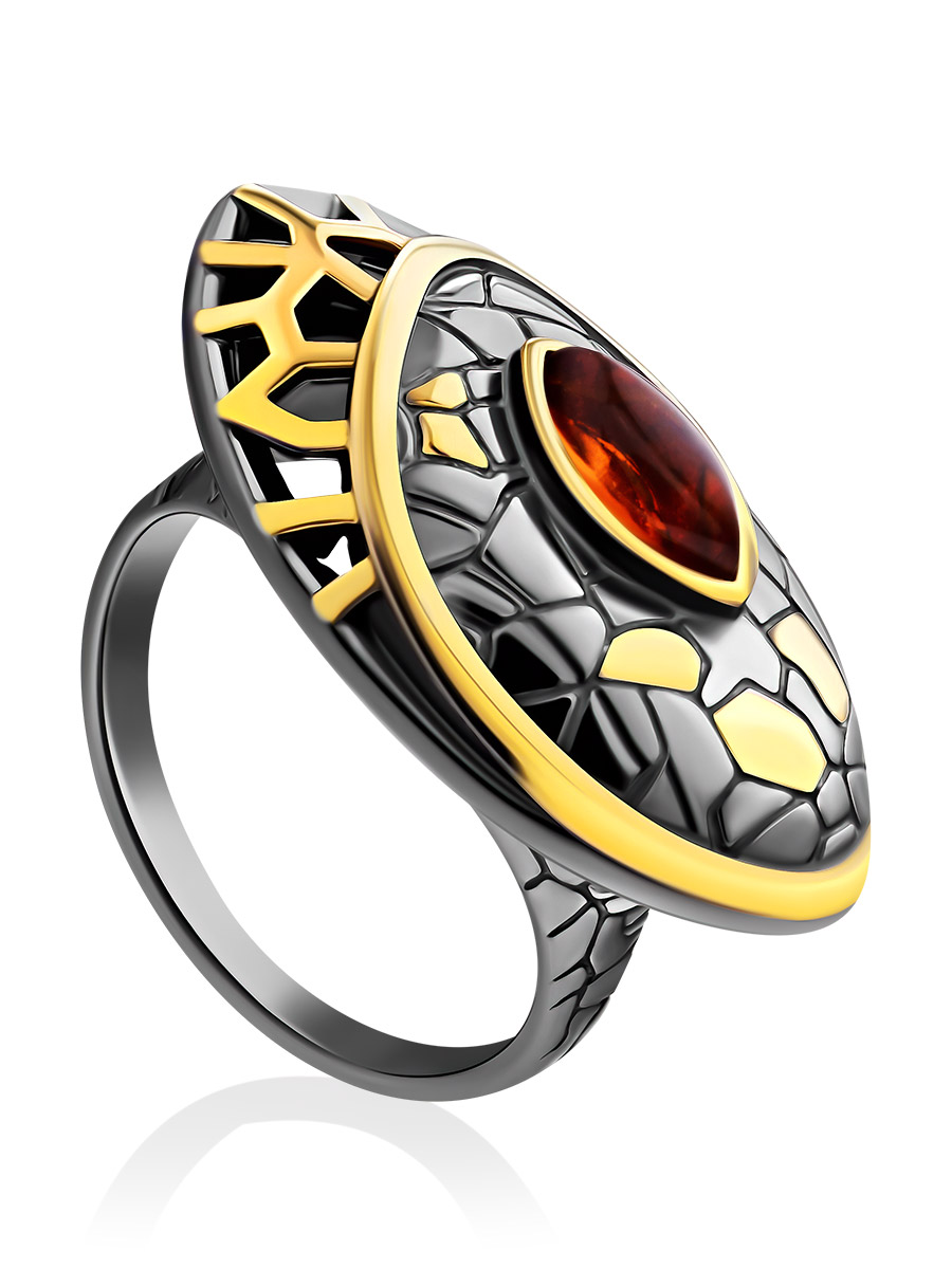 Серия украшений «Донателла» создана из яркой мозаики — из благородного черненого серебра и ярких позолоченных чешуек, из ажурных окошек и солнечных янтарных бликов, из фантазии и хорошего вкуса. Такое кольцо на вашем пальце не останется незамеченным, а вы не останетесь без комплиментов. _x000D_