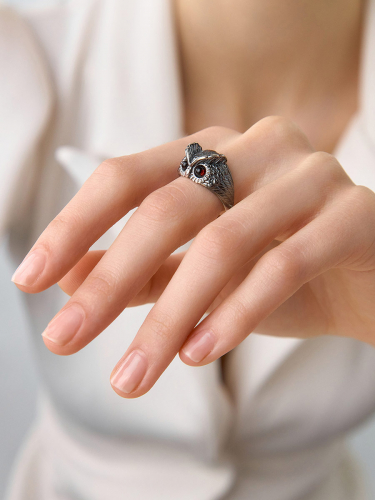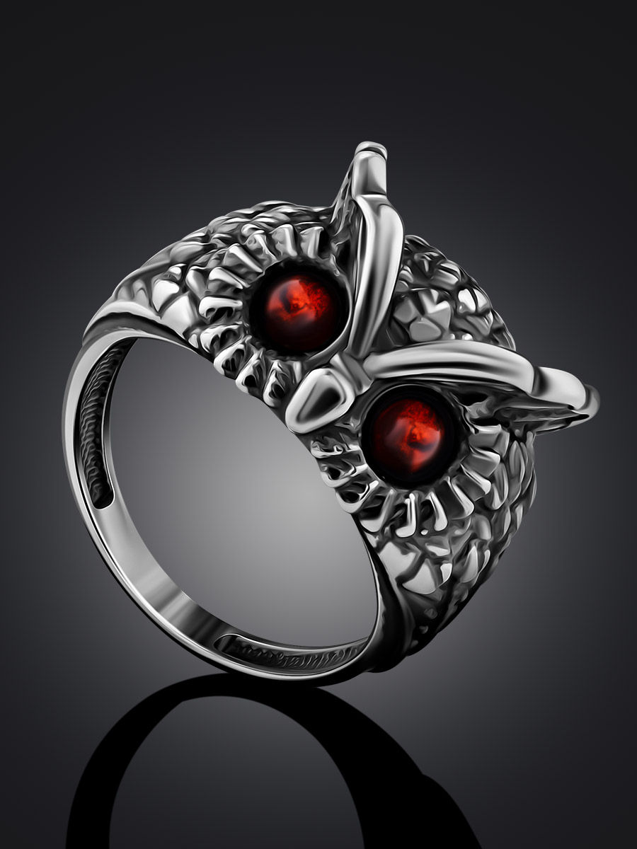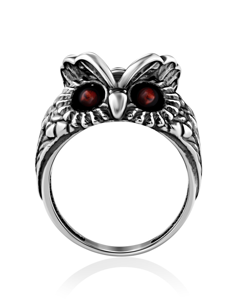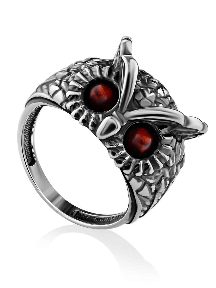 Оригинальное объёмное кольцо, украшенное вишнёвым янтарём «Филин»