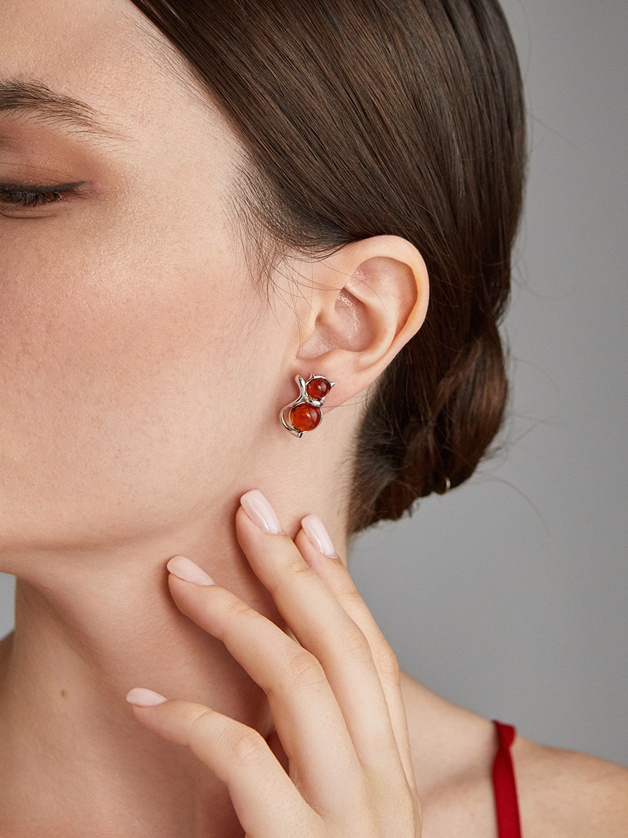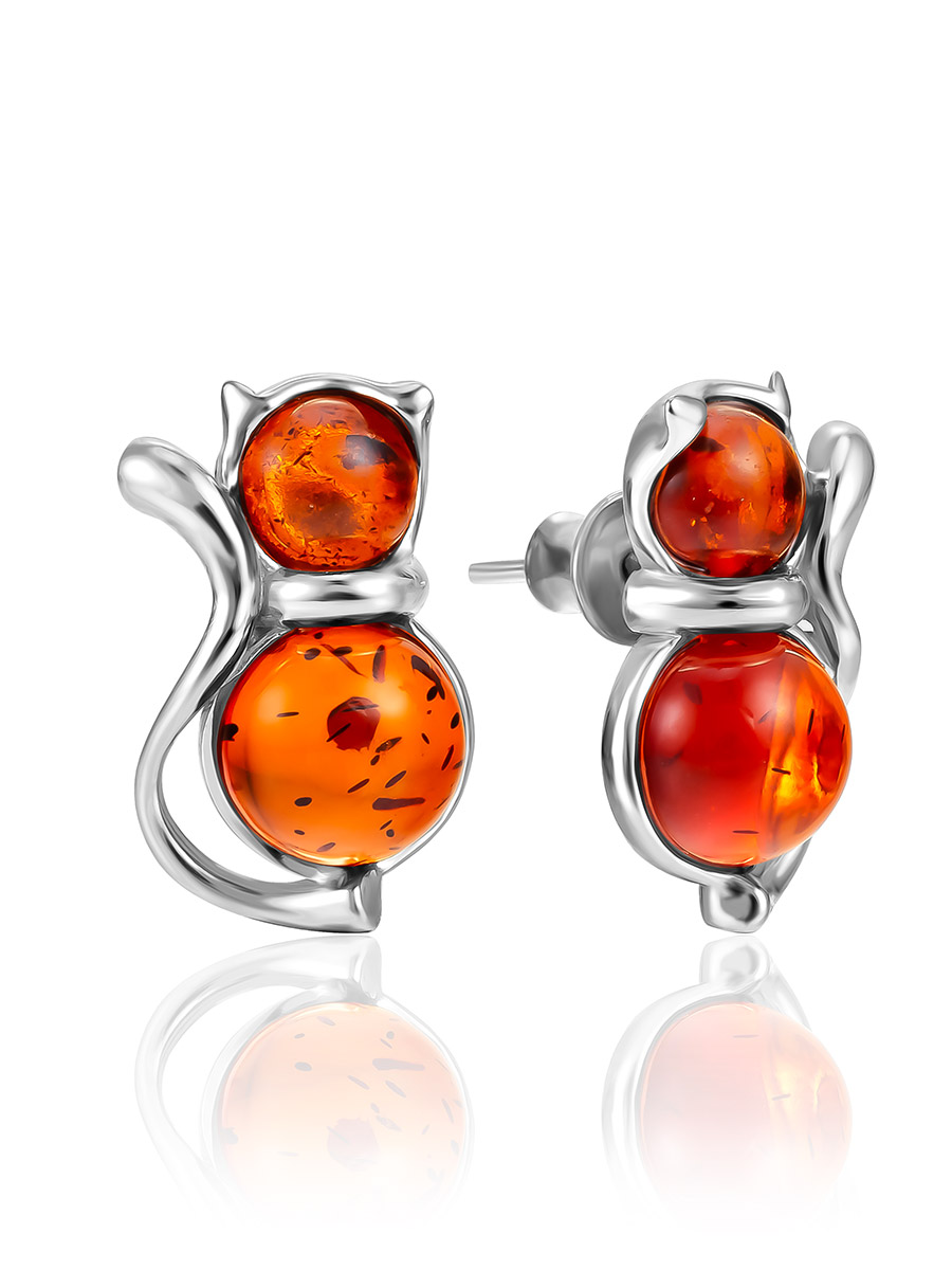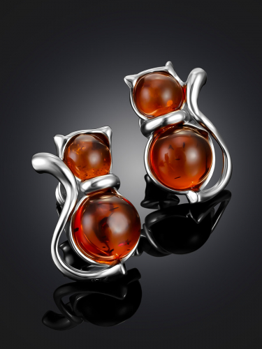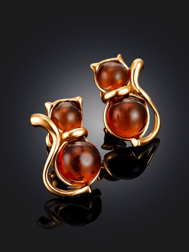 Оригинальные серьги с замком-гвоздиком «Кошечка», украшенные коньячным янтарём