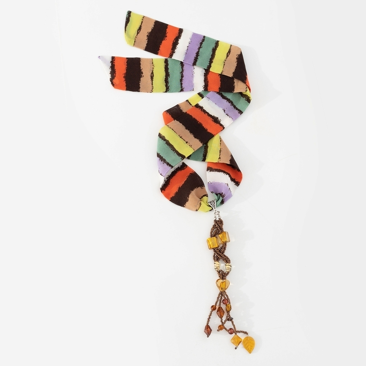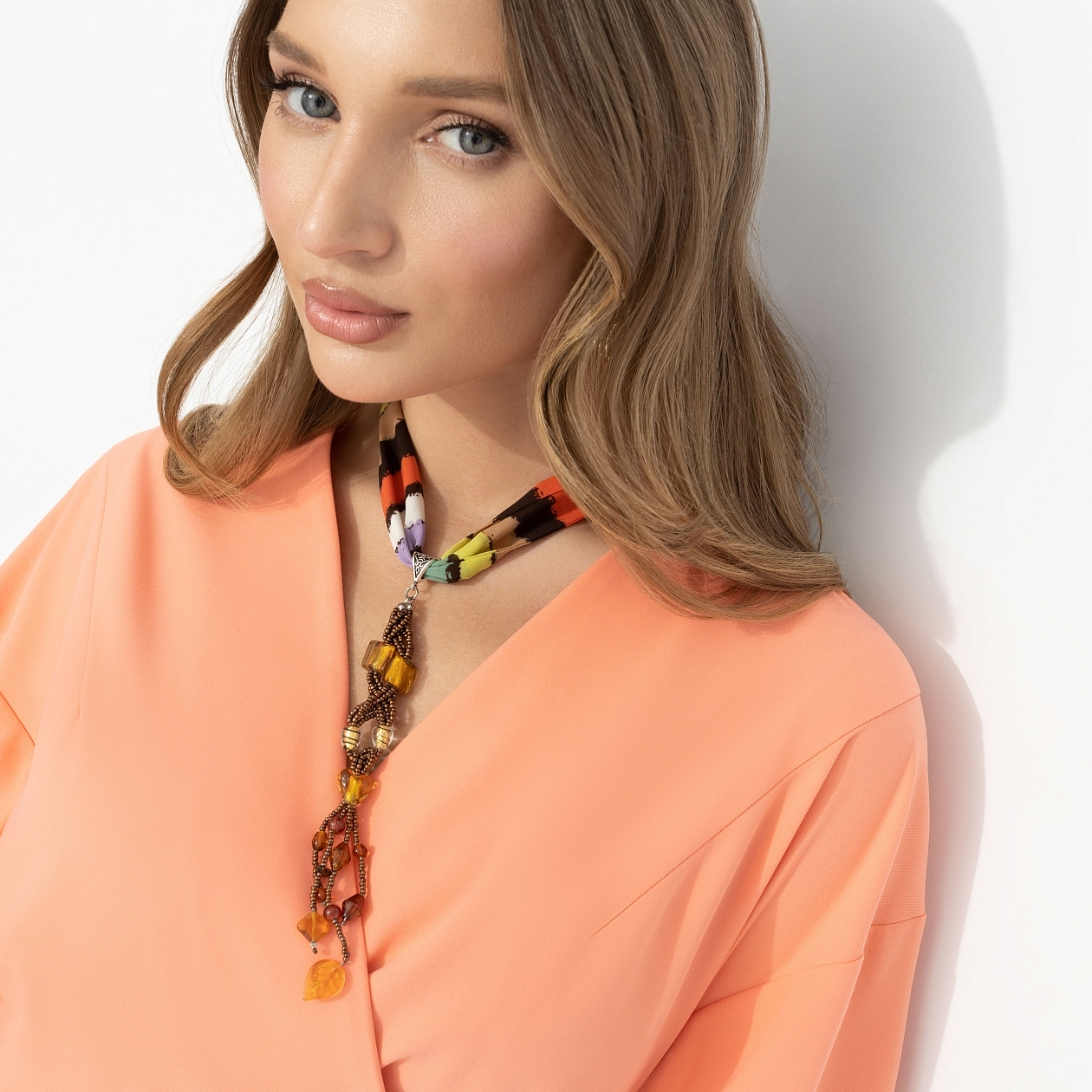Он, как случайная искра, которая запускает всё настроение образа. Маленький импульс − и горячий, эффектный выход! Подвес с насыщенной цветовой палитрой и фактурой из бисера и бусин собирает внимание в центре образа. Мягкая основа и подвижные элементы создают живое движение при каждом шаге. Лучше всего работает с минималистичными сочетаниями − чтобы вся энергия и характер остались в одной детали. Используйте как ожерелье или как подвес на сумку.