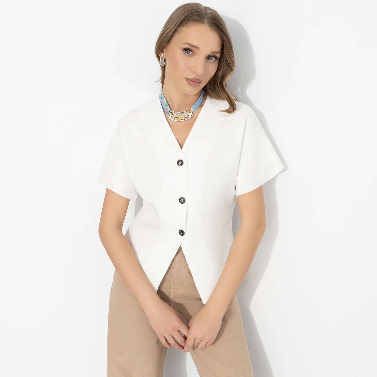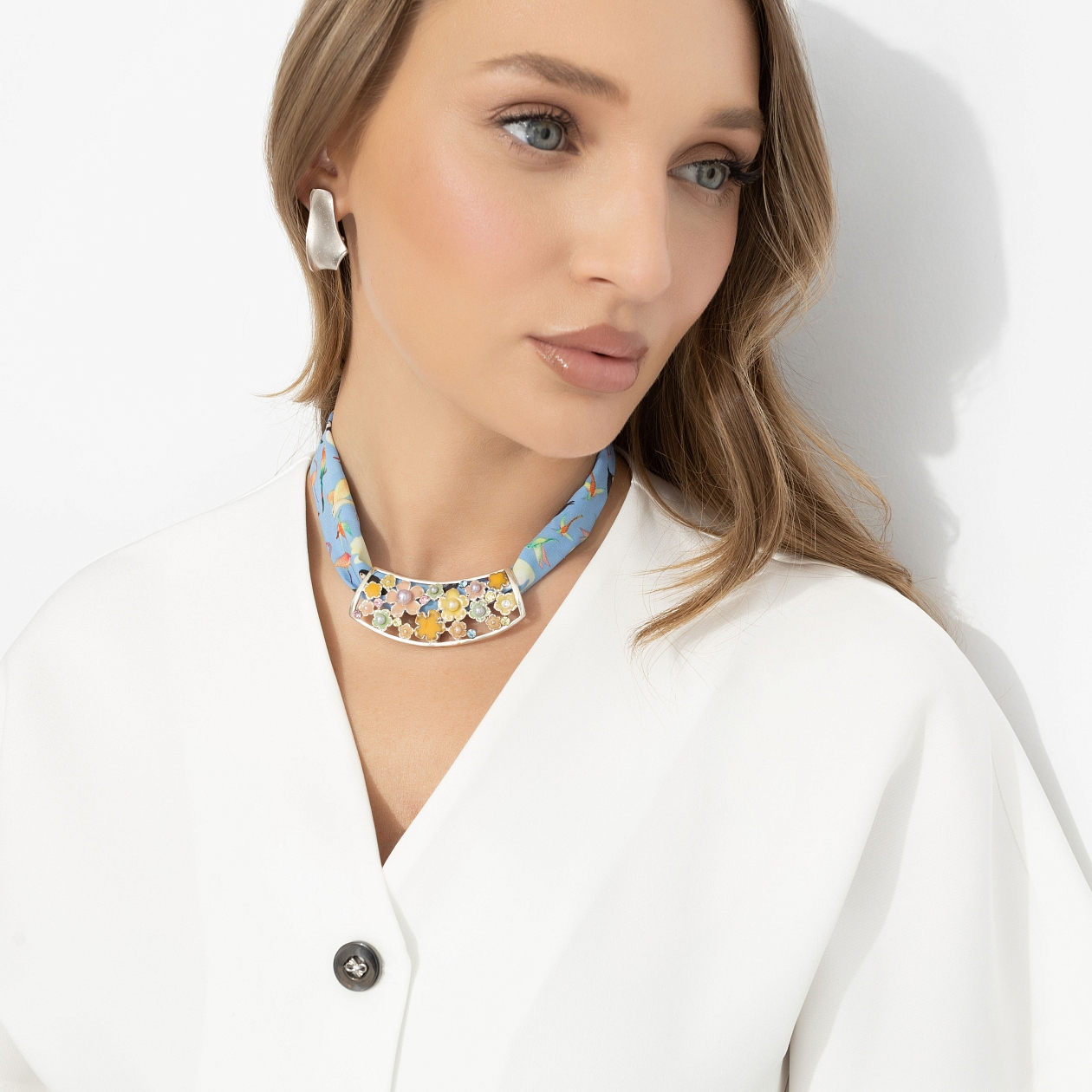 Лаконичный мейк-ап, ясный взгляд, минимум лишнего − и вдруг акценты начинают звучать особенно громко. Подвес с сочетанием голубого, тёплого золота и ярких эмалевых деталей идеально работает на светлой, «чистой» внешности − блонды, русые, мягкие шатены. Освежает тон кожи, подчёркивает глаза и добавляет образу собранности. Лучше всего раскрывается с лаконичной базой − рубашками, жилетами, простыми топами. Используйте как ожерелье или как подвес на сумку.