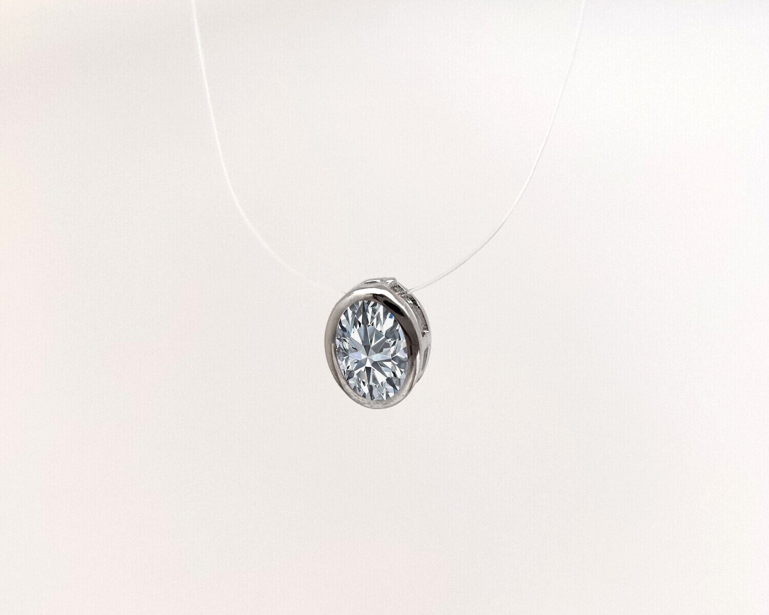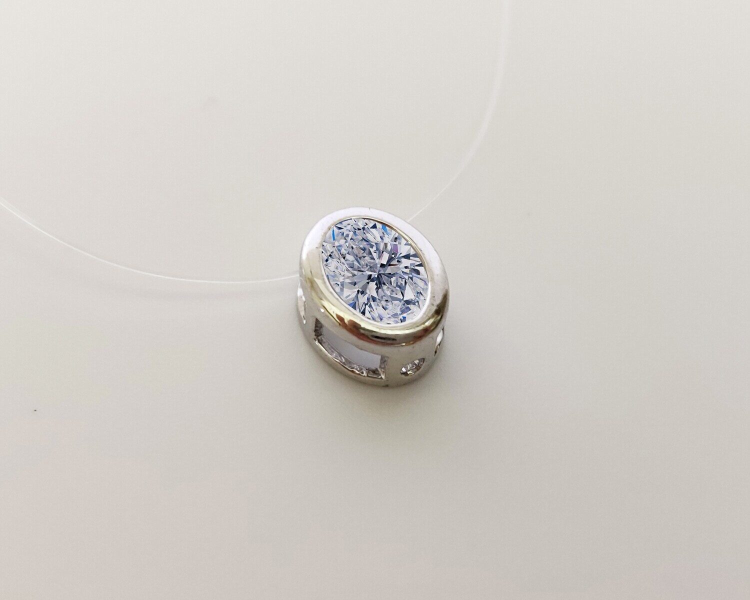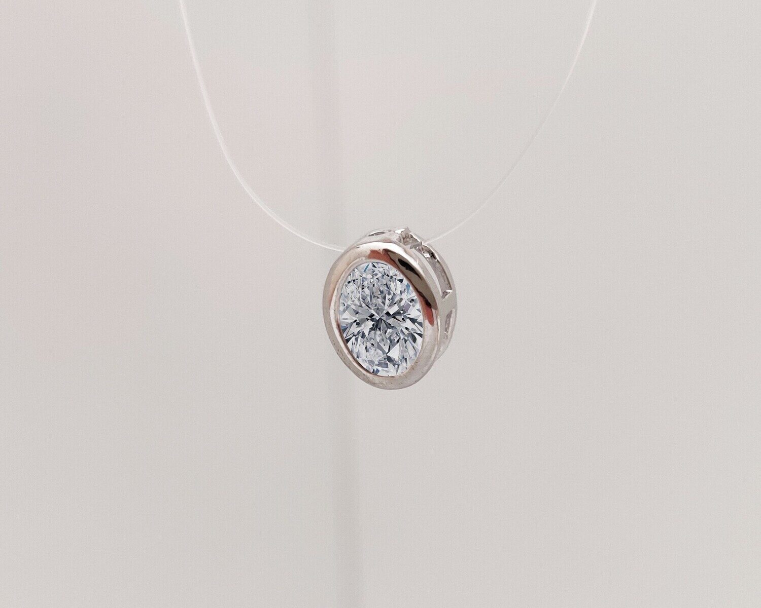 Кулон висит на леске, которая смотрится очень нежно и аккуратно, она прочная и не вызывает раздражения на коже.