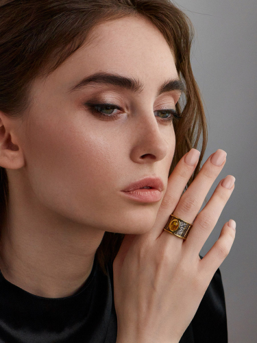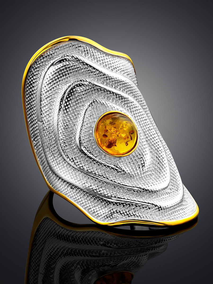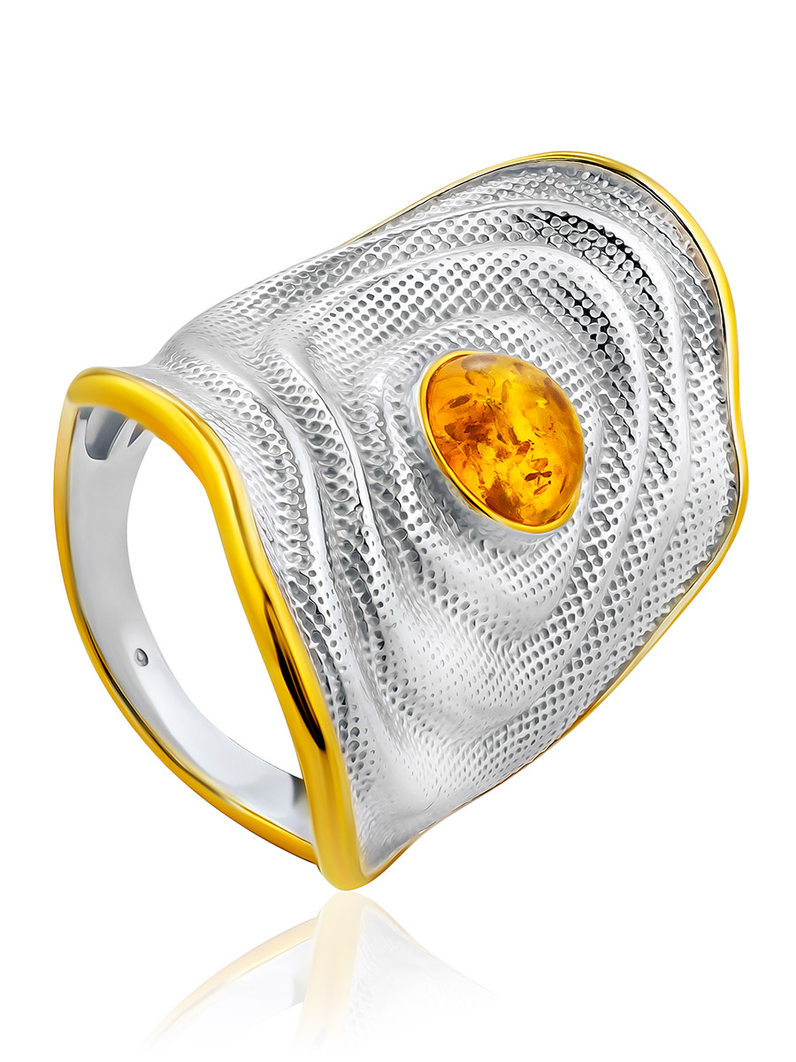 Размеры камня (мм): 7 Вес изделия..показать (г): 9 Цвет: лимонный / коньячный Материалы: Серебро 925° / Натуральный янтарь / ПозолотаКрупное широкое кольцо из фактурного серебра с золочением, украшенное янтарём «Сальвадор»: 210001439_x000D_