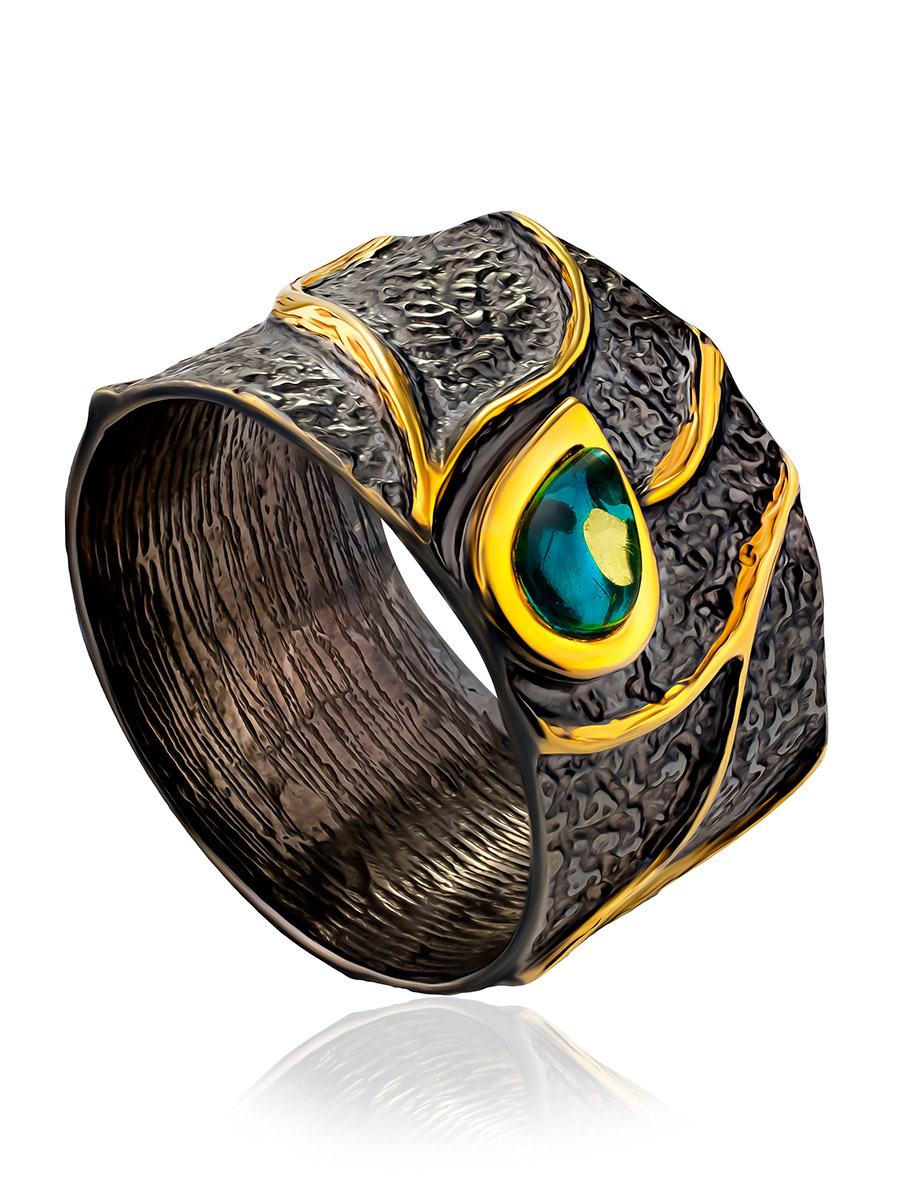 Потрясающее широкое кольцо из чернёного серебра и ярко-голубого янтаря «Элементаль»