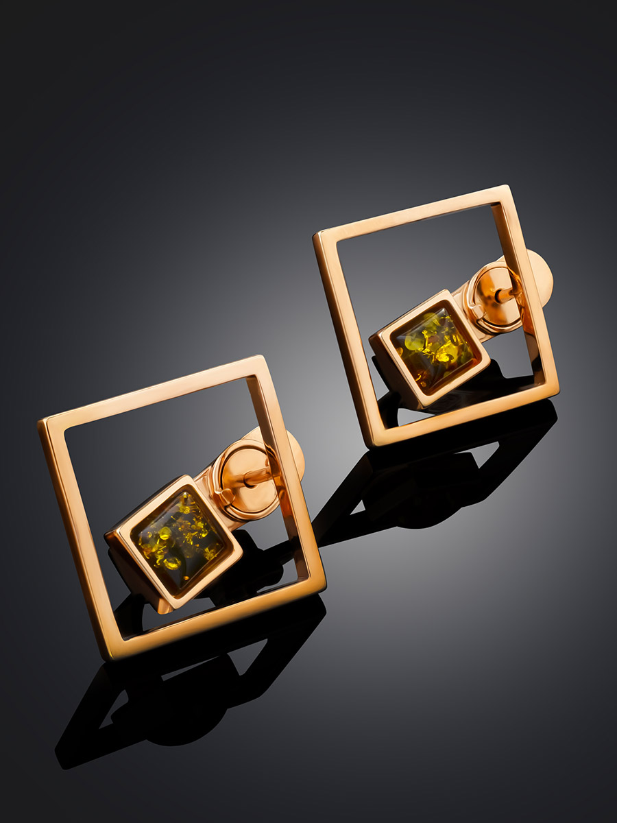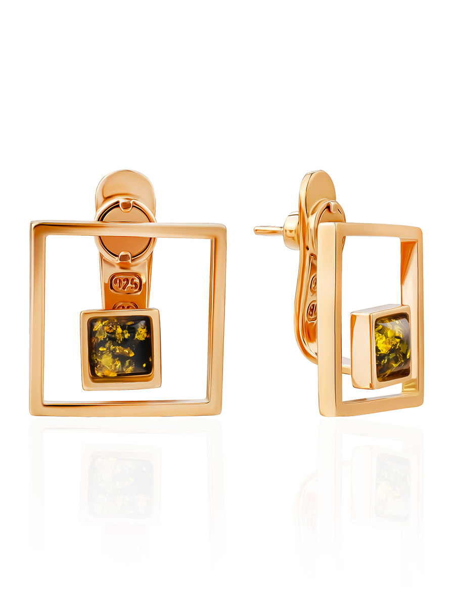 Позолоченные серьги «Гравитация» с искрящимся зелёным янтарём