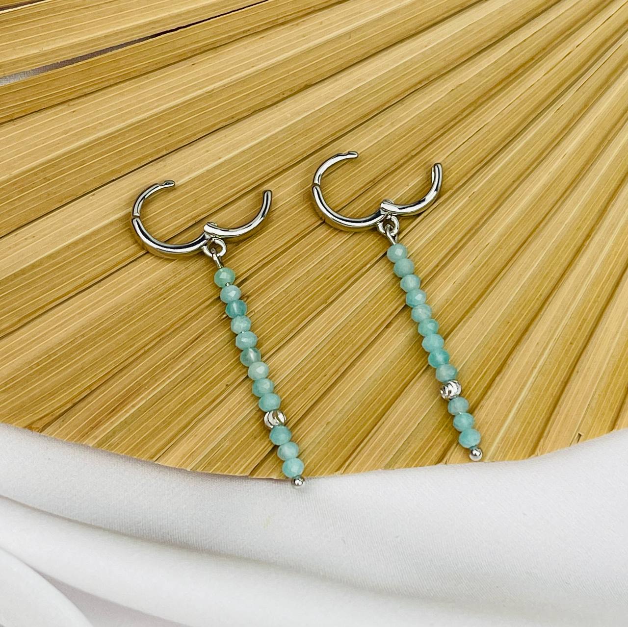 Цвет камня: Бирюзовый Месторожден..показатьие: Перу Камень: Амазонит Покрытие: Родий (покр) Длина сережки: 45 мм Поверхность: Граненый Размер: 2х3 мм Производитель: Радуга Самоцветов (Россия) Тип швензы: Кольцевой замокие: Перу