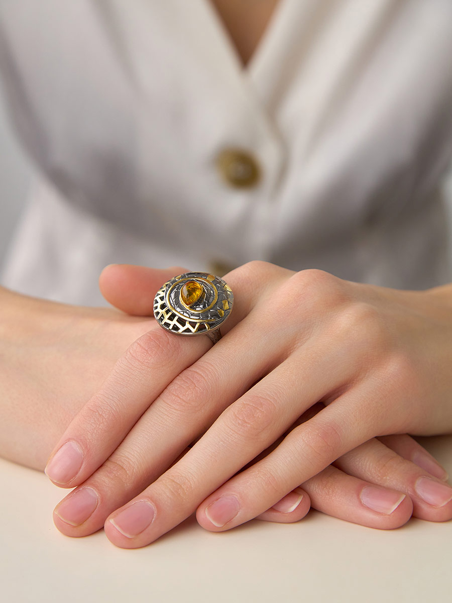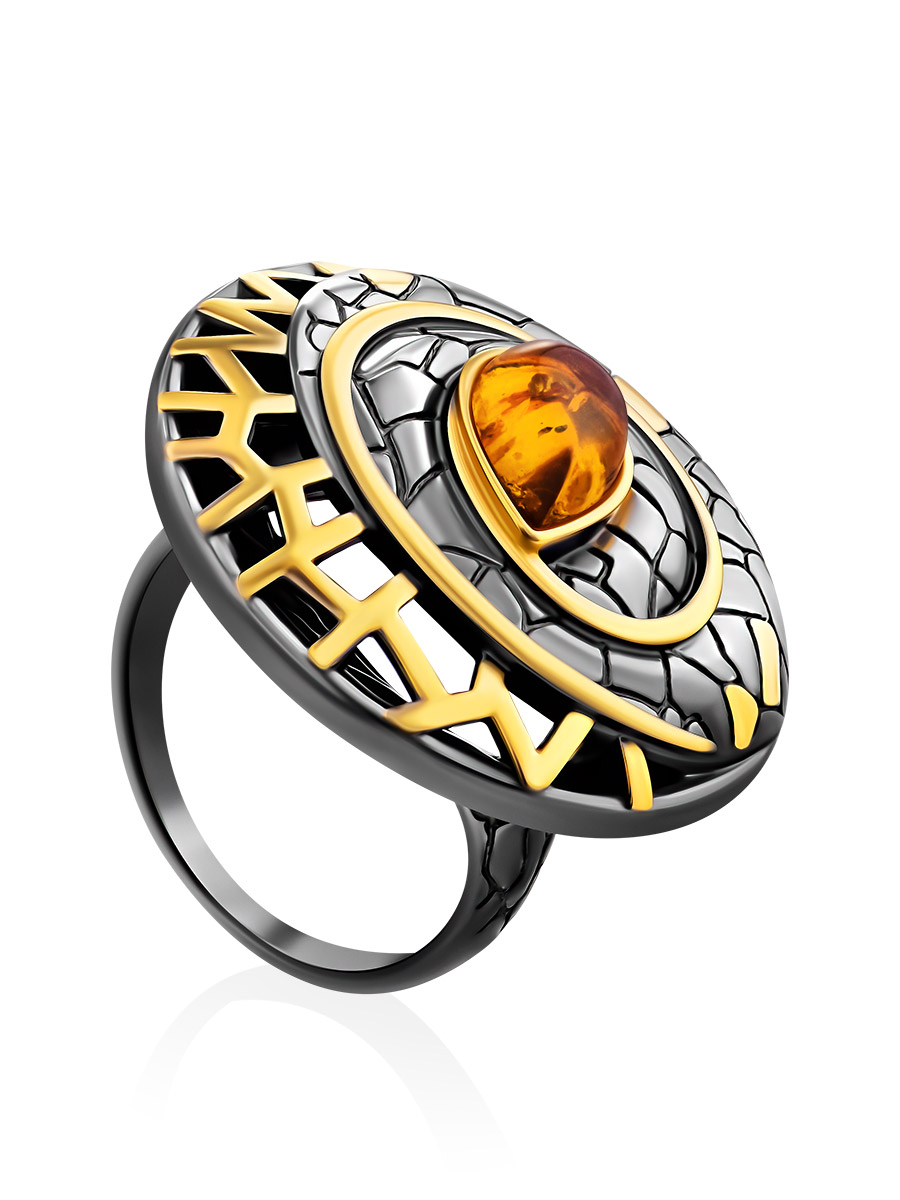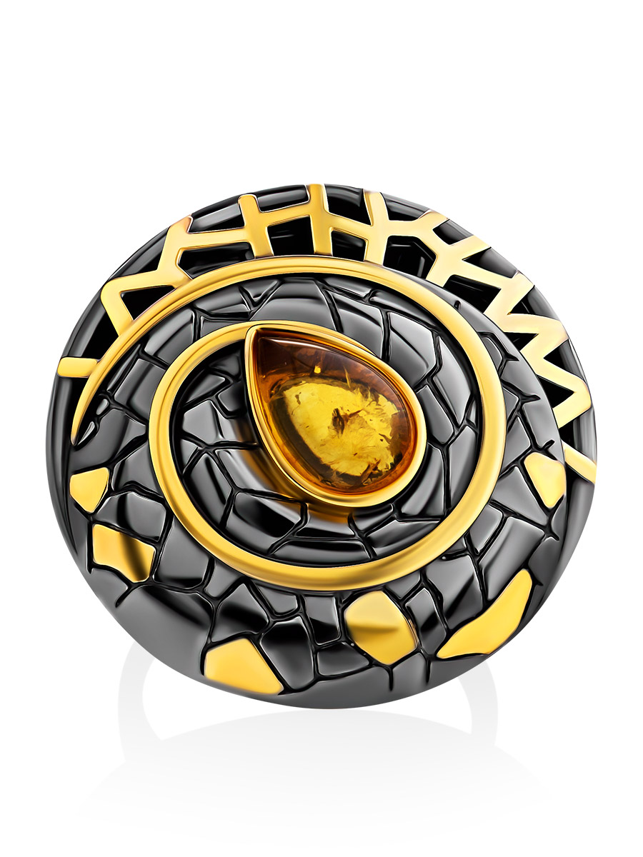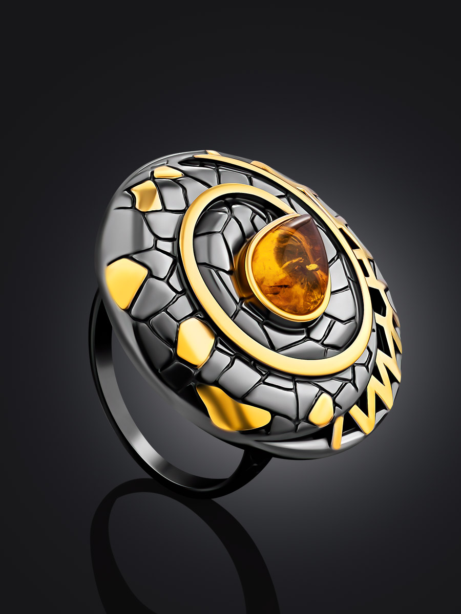 Роскошное кольцо «Донателла» из чернёного серебра с золочением, украшенное янтарём