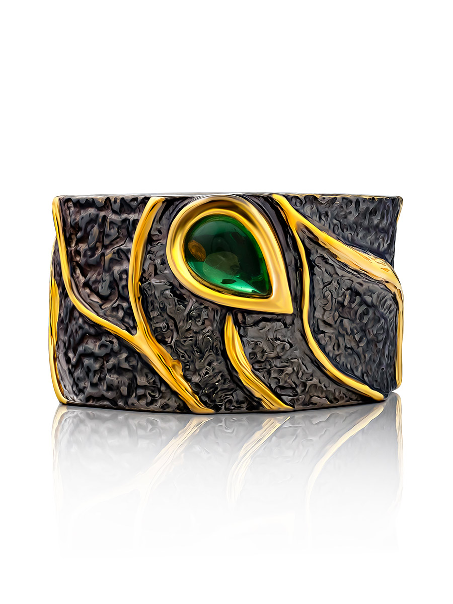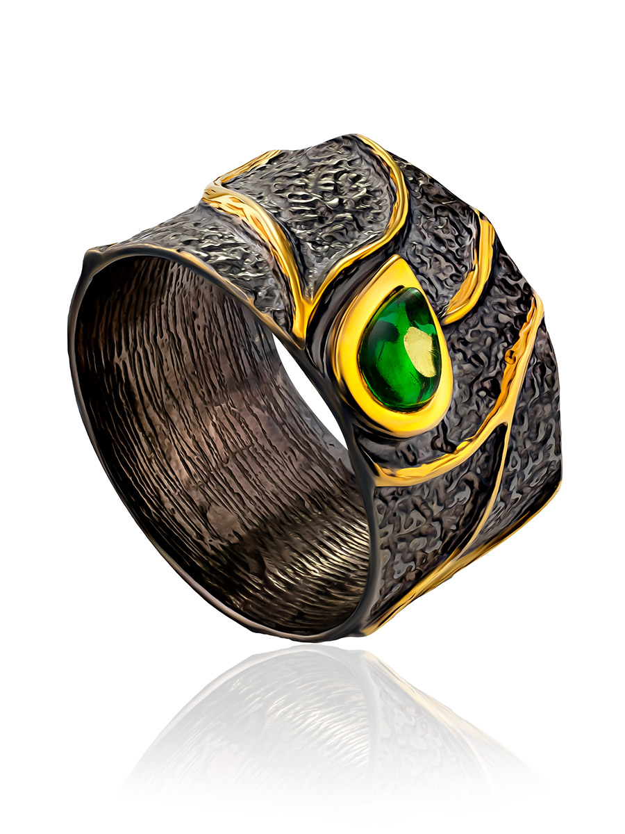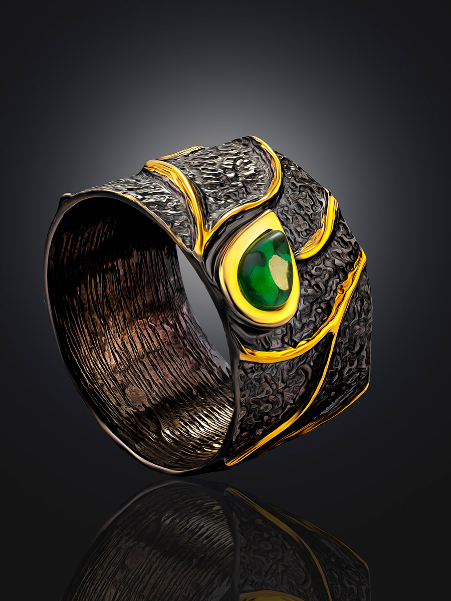 Роскошное кольцо из серебра с чернением и золочением и янтарём изумрудного оттенка «Элементаль»