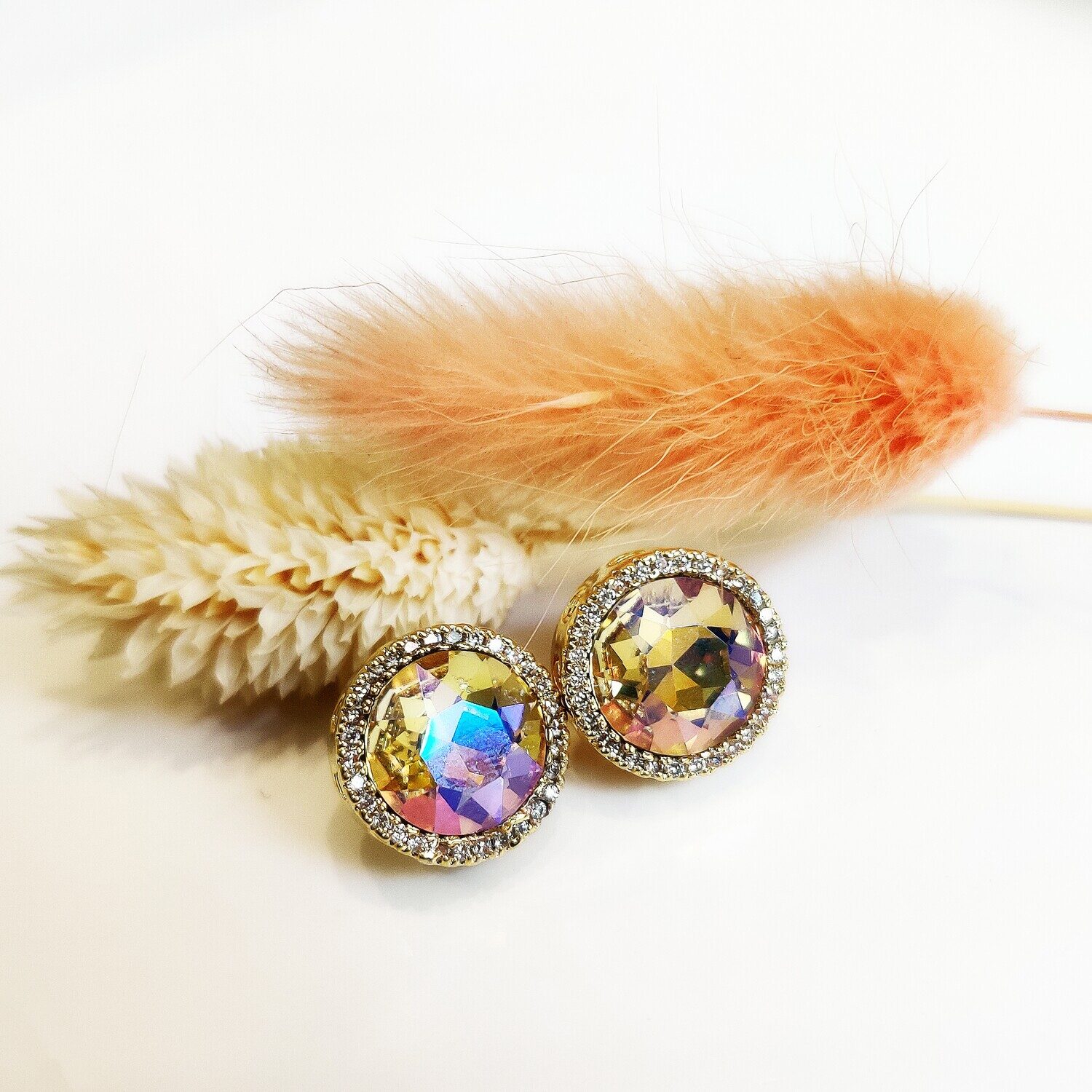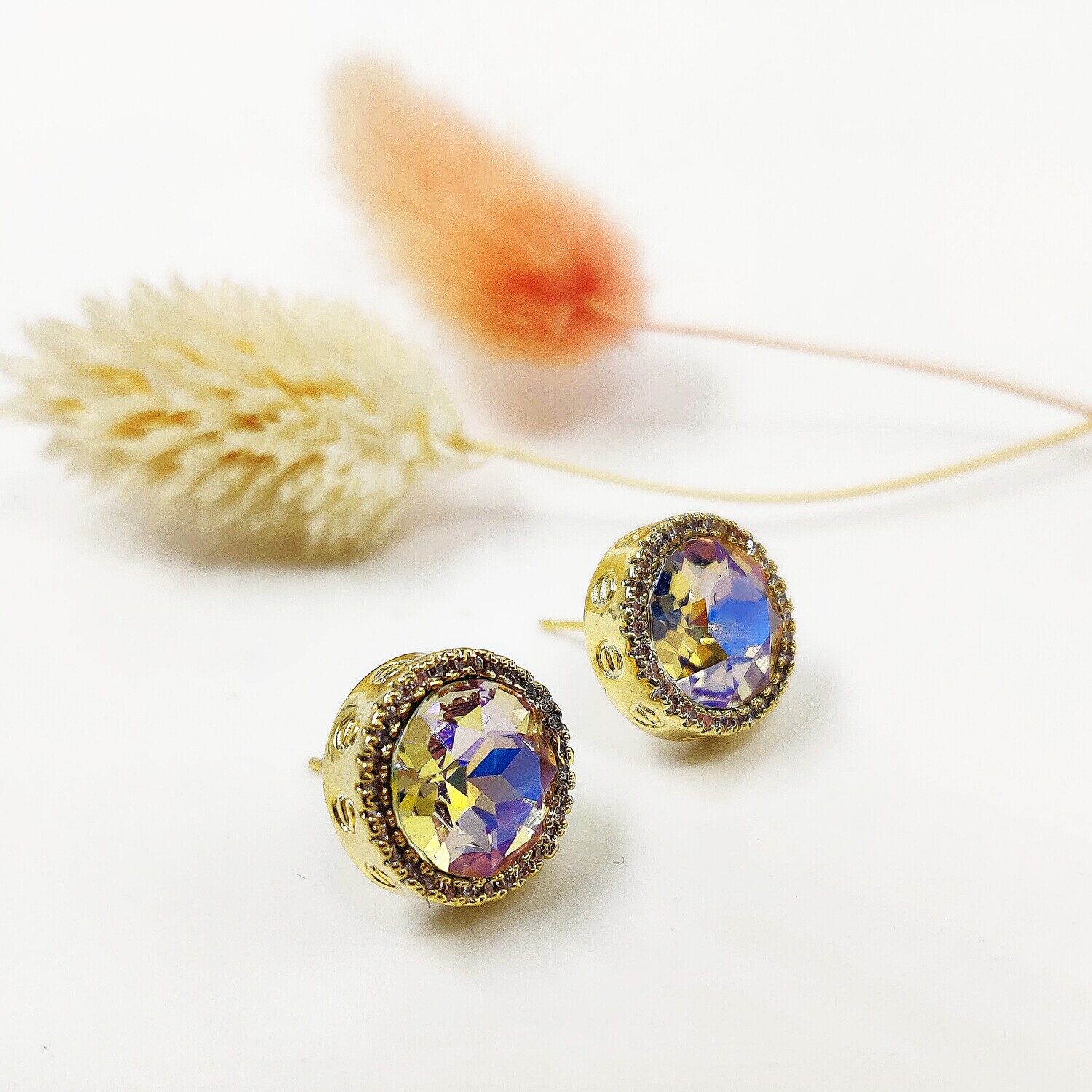 Красивые серьги из специального гипоаллергенного ювелирного сплава, который покрыт золотом или устойчивым родиевым покрытием, предотвращающим раздражение кожных покровов.Диаметр кристалла 10.5 мм