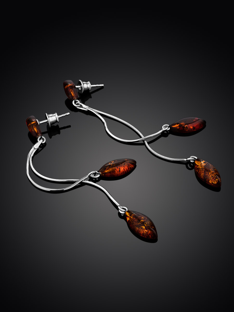 Серьги-цепочки, украшенные натуральным коньячным янтарём «Листочки»