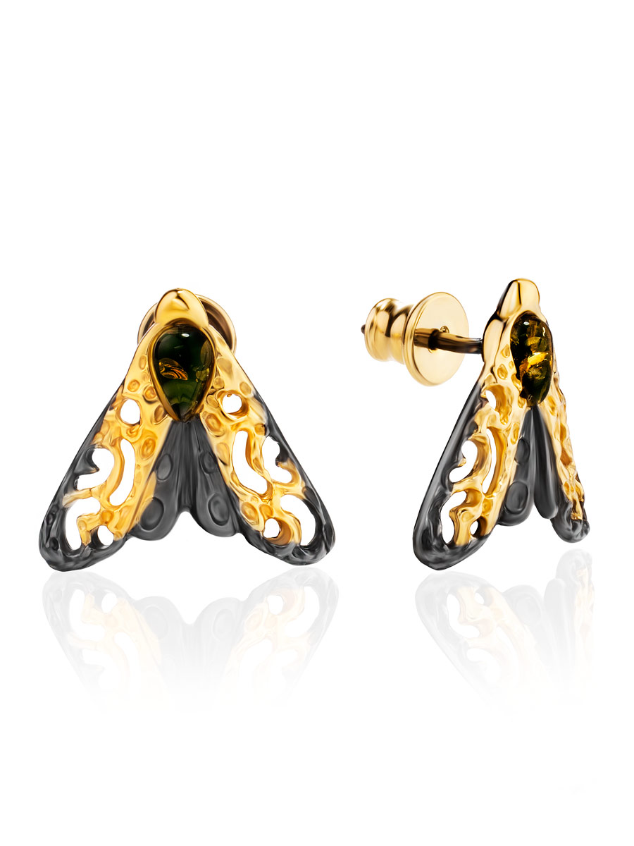 Серьги-гвоздики «Цокотуха» с янтарём зелёного цвета