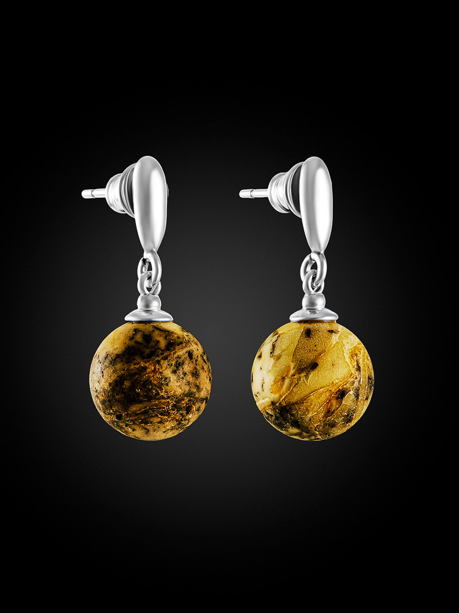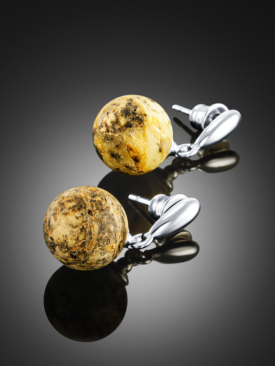 Серьги-гвоздики из натурального янтаря с сатиновой поверхностью «Метеорит»