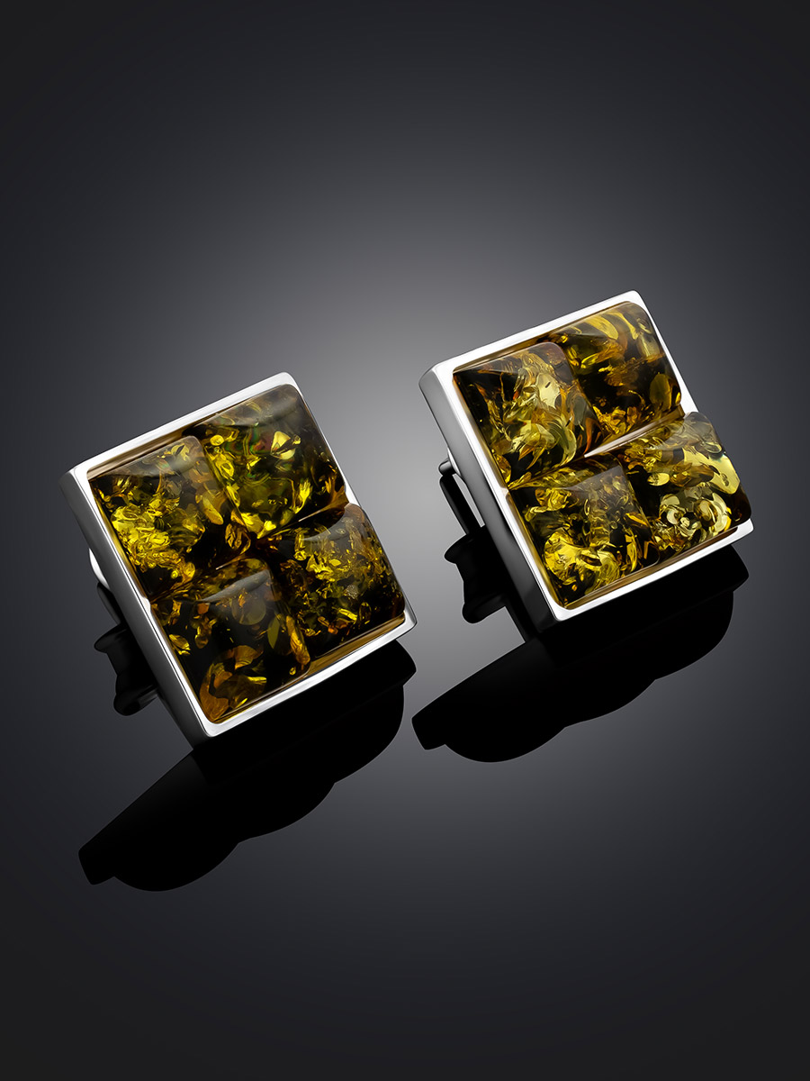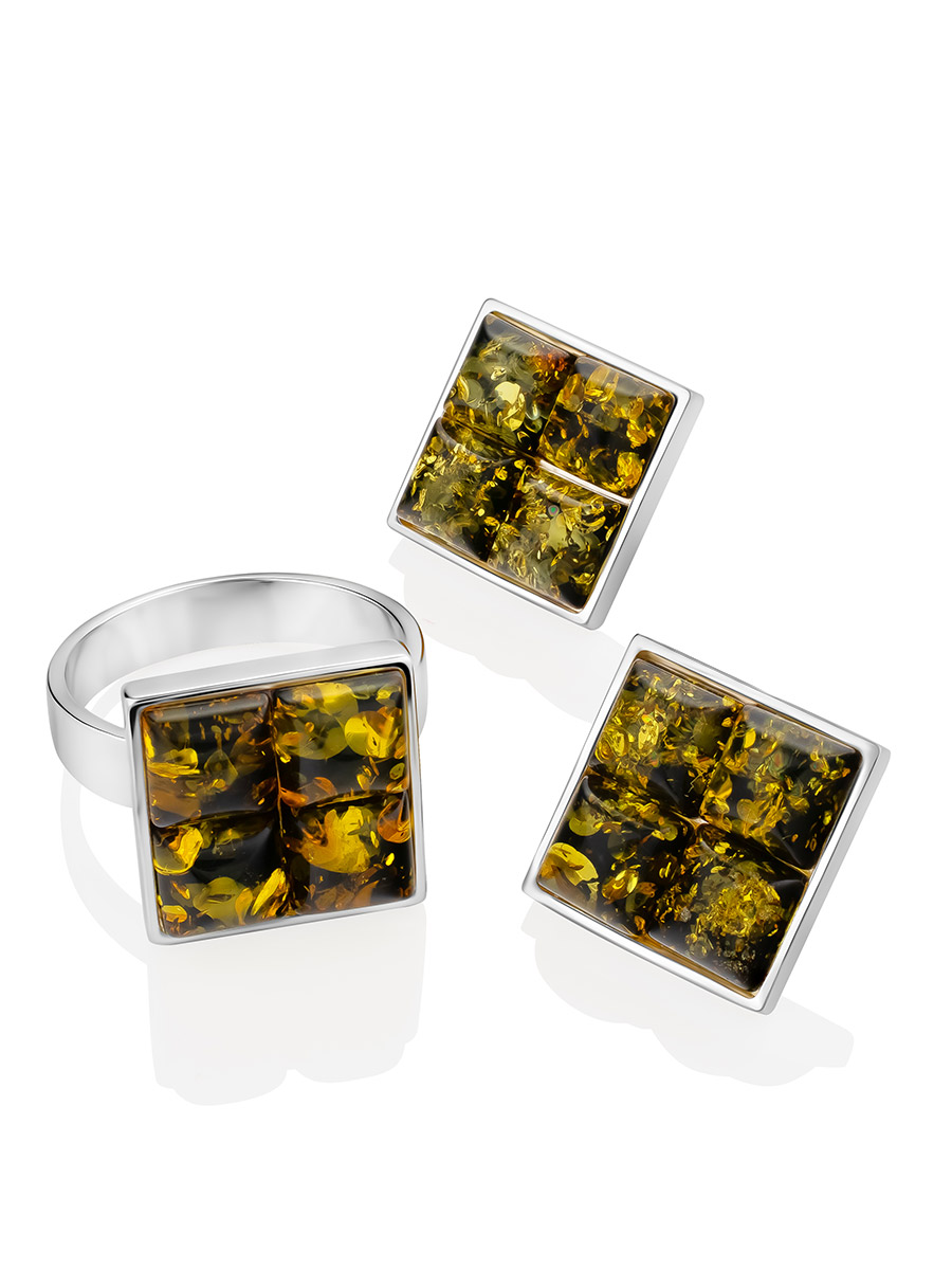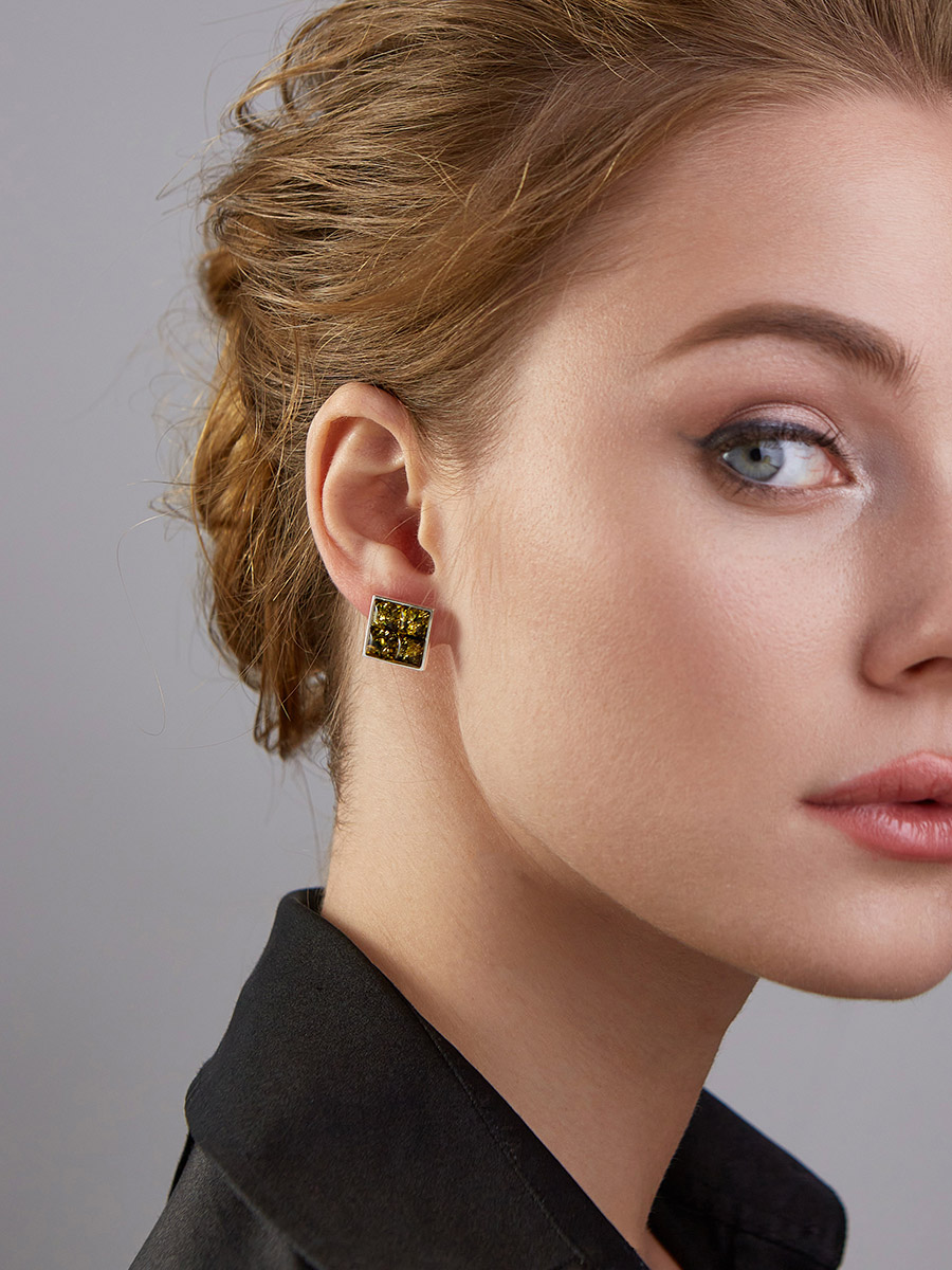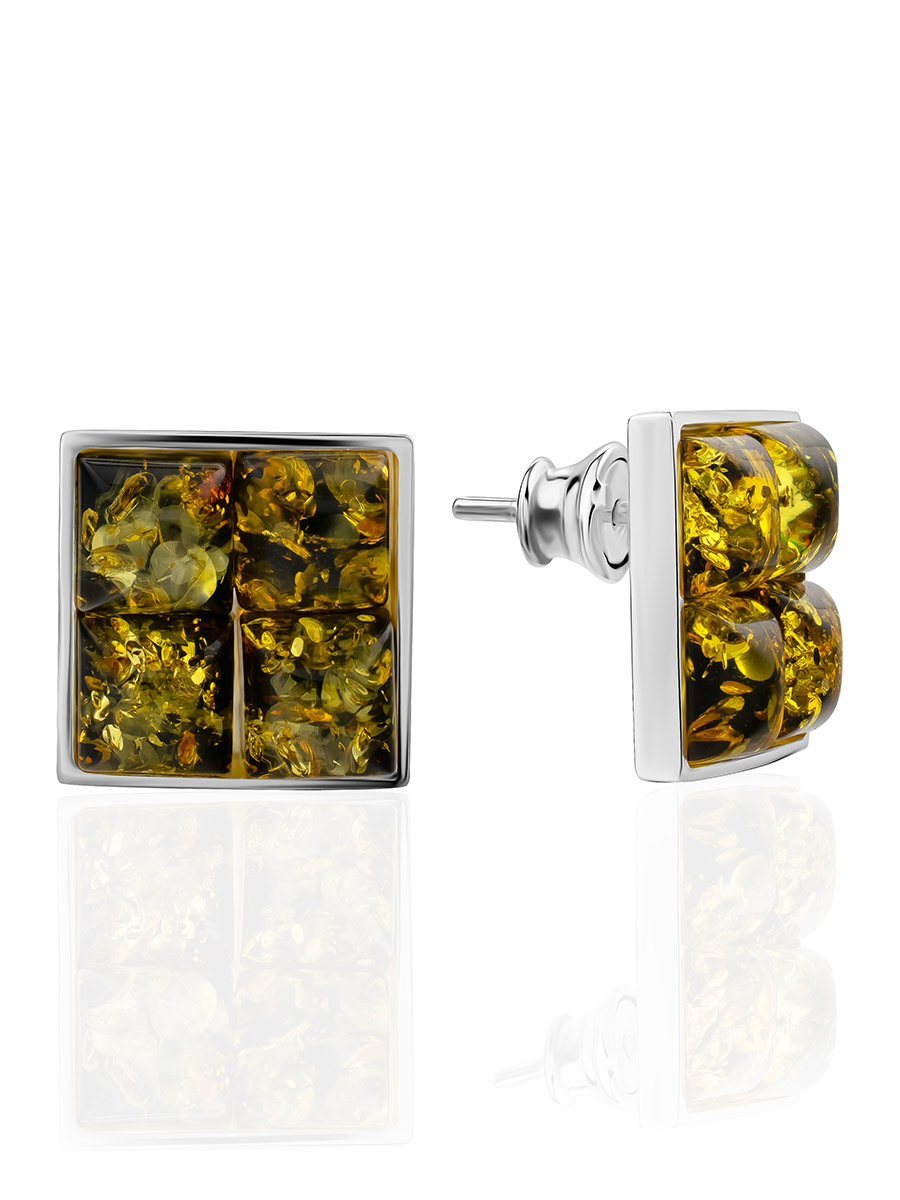 Серьги-гвоздики квадратной формы с зелёным янтарём «Коломбина»