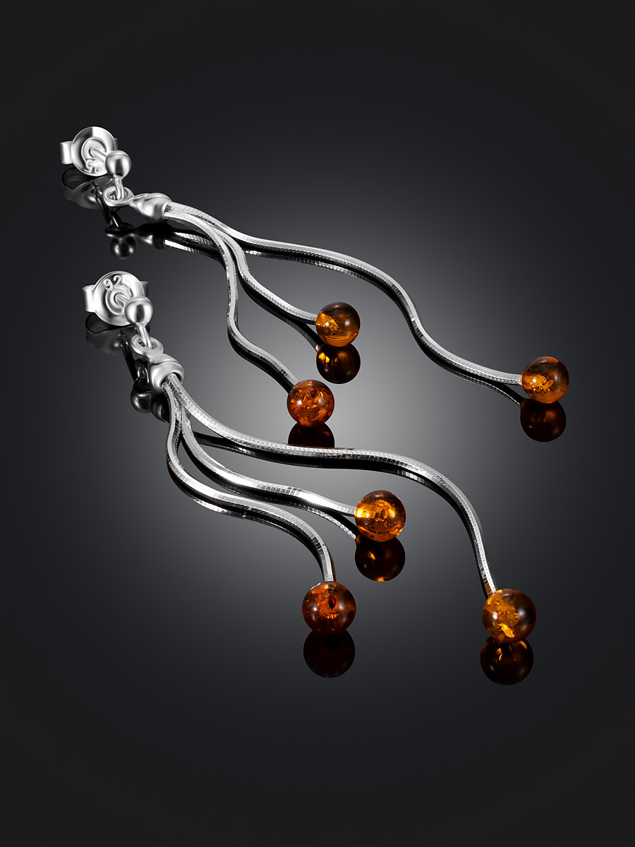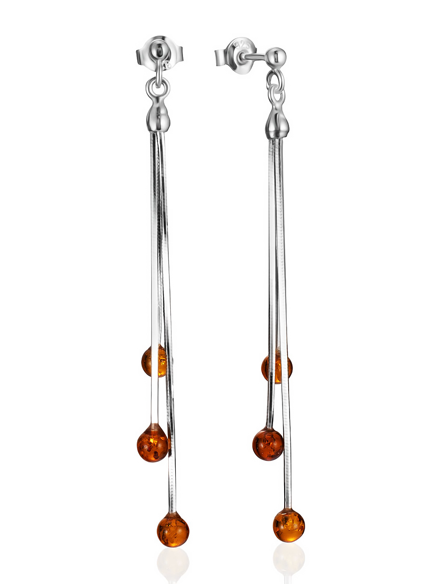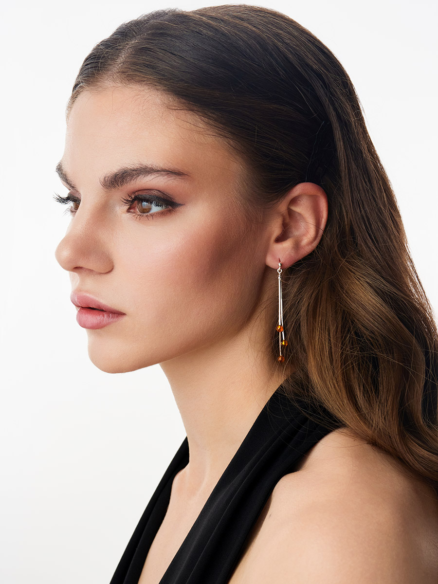 Серьги-гвоздики «Рябина» с янтарём на цепочках