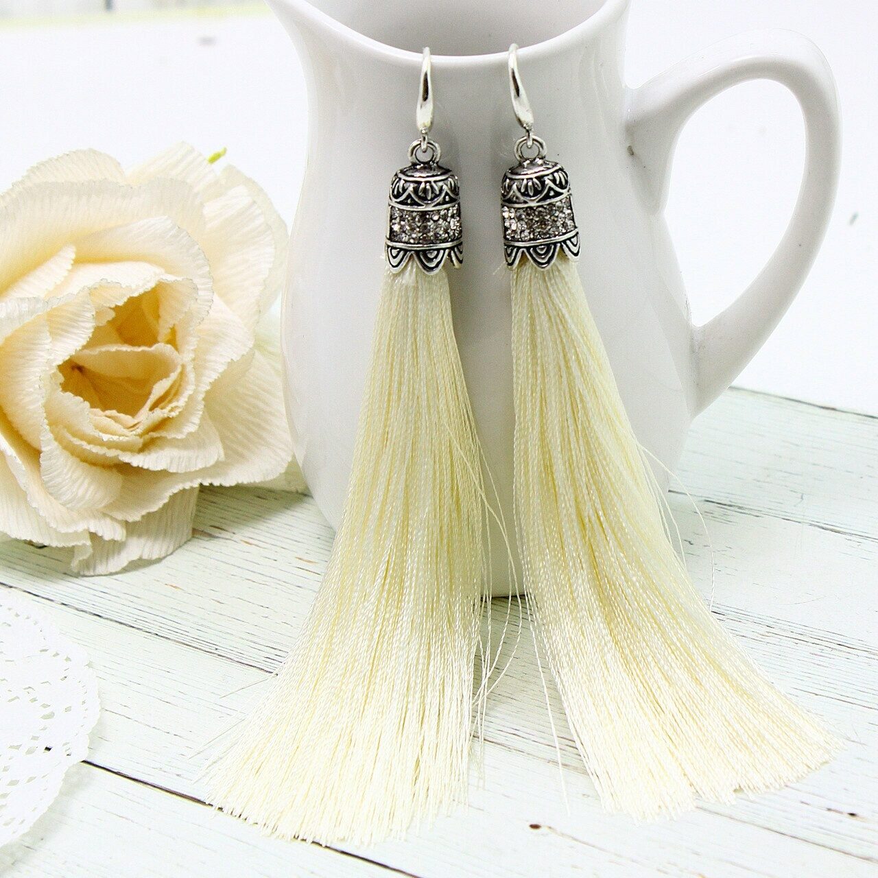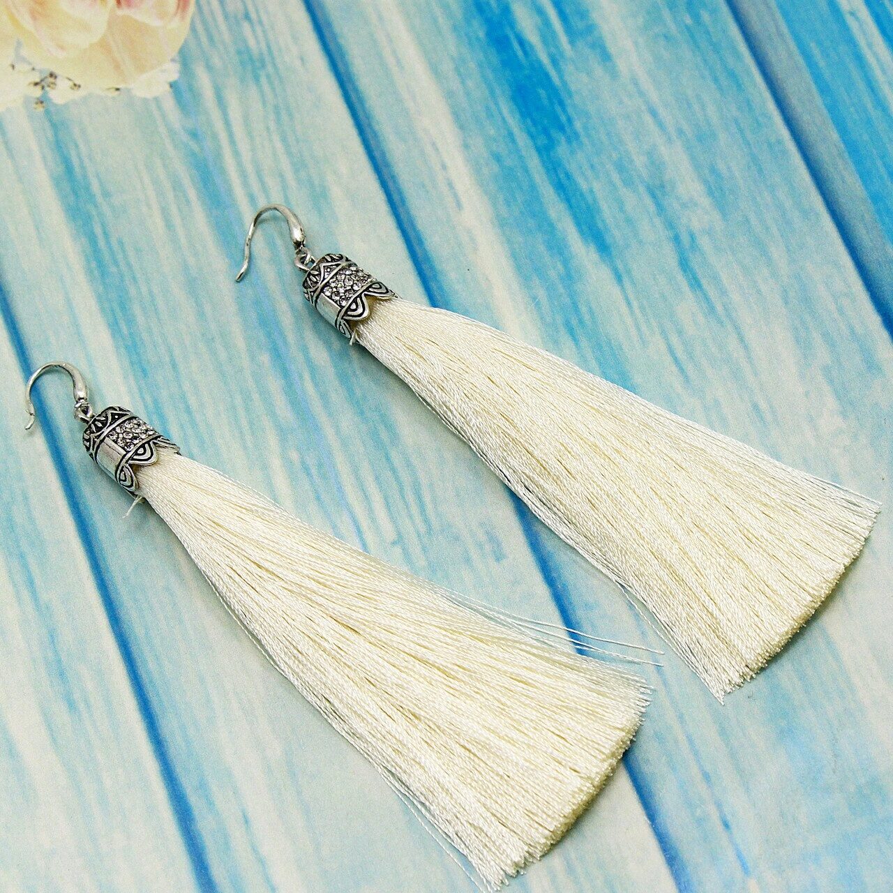 Серьги Красивые серьги изготовлены из специального гипоаллергенного ювелирного сплава, предотвращающим раздражение кожных покровов. Длина 10 см