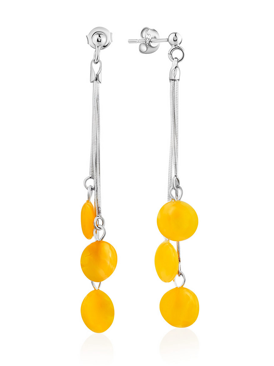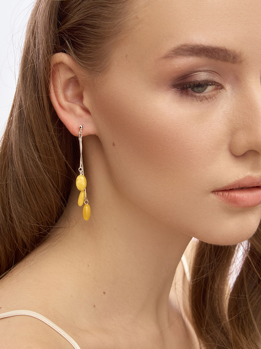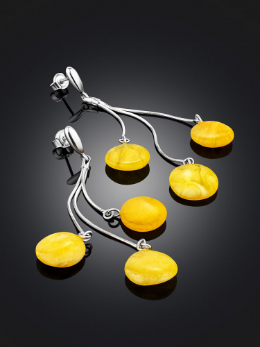 Серьги на замочках-гвоздиках с натуральным янтарем «Медовые пуговки на цепочке»