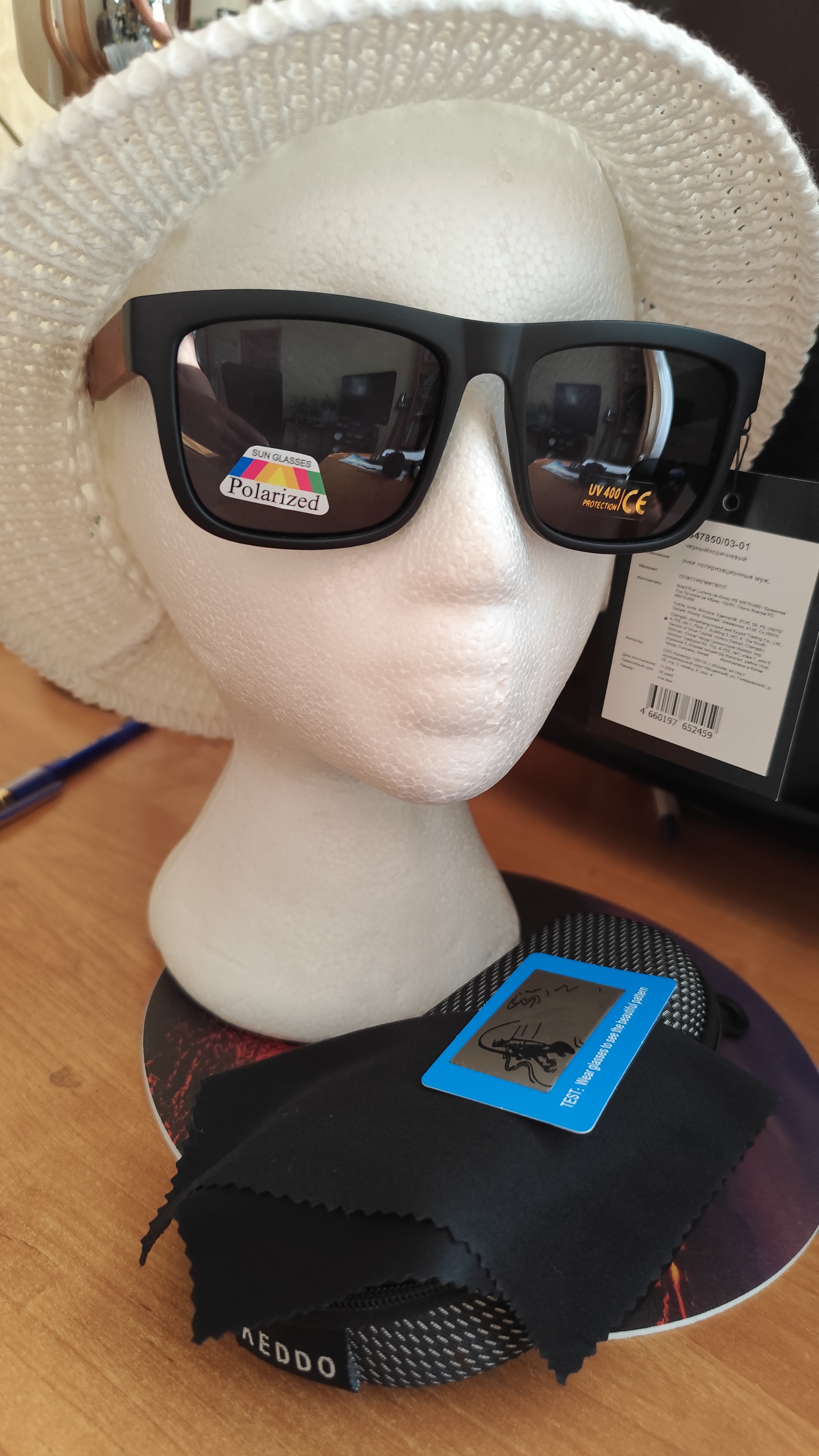 В комплекте футляр для очков, тряпочка и тестовая картинка для проверки поляризации очков.