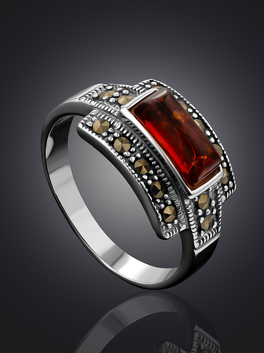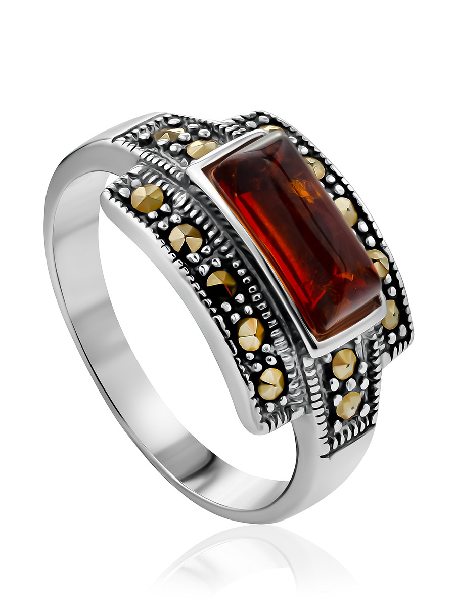 Стильное кольцо «Эйфория» с коньячным янтарем и марказитами