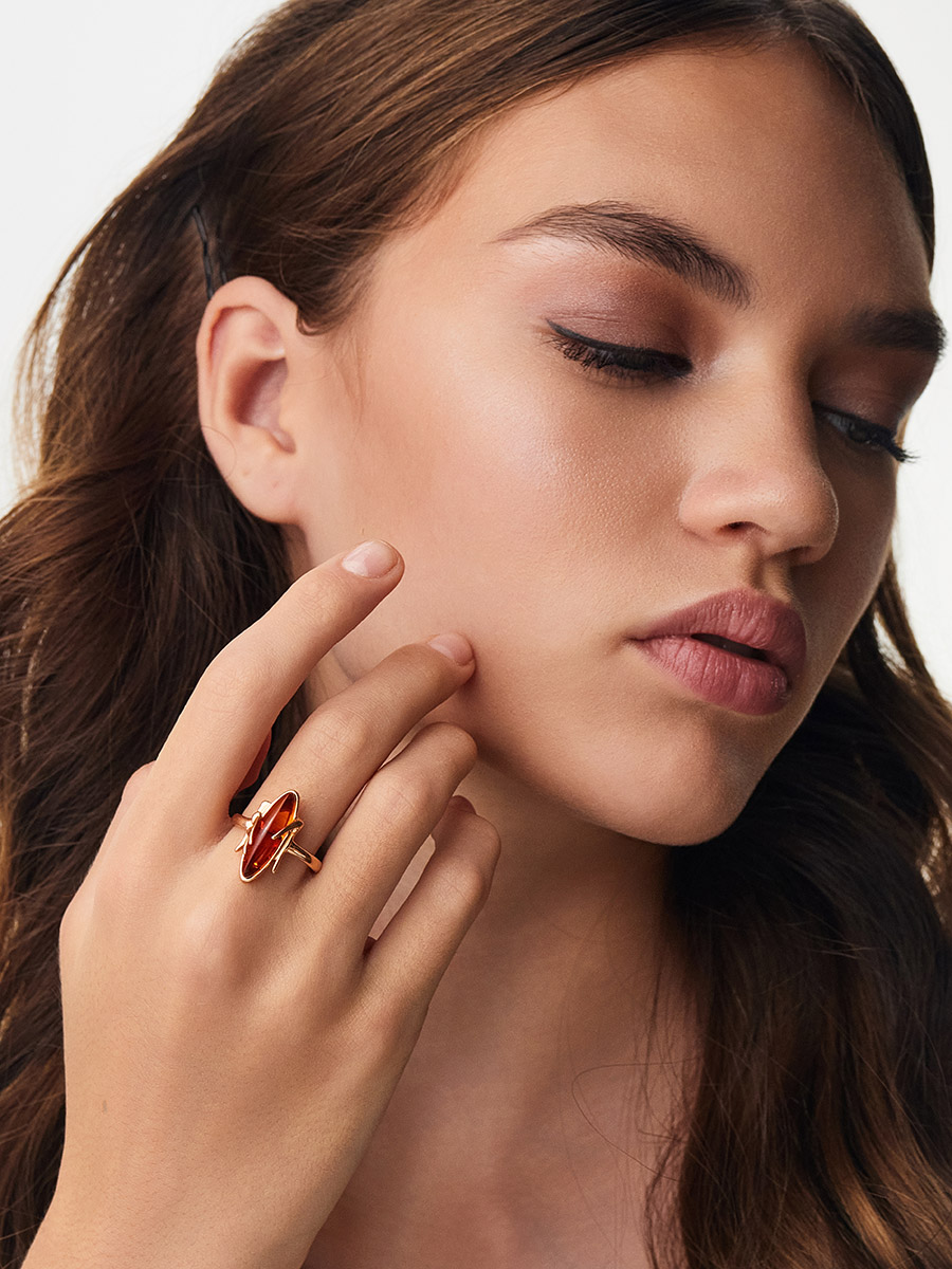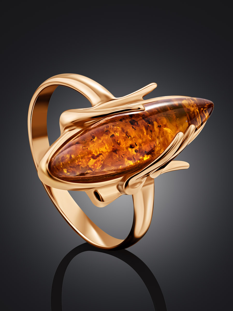 Стильное кольцо «Фудзияма» из янтаря коньячного цвета