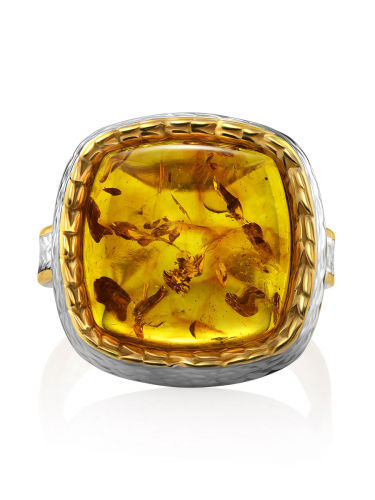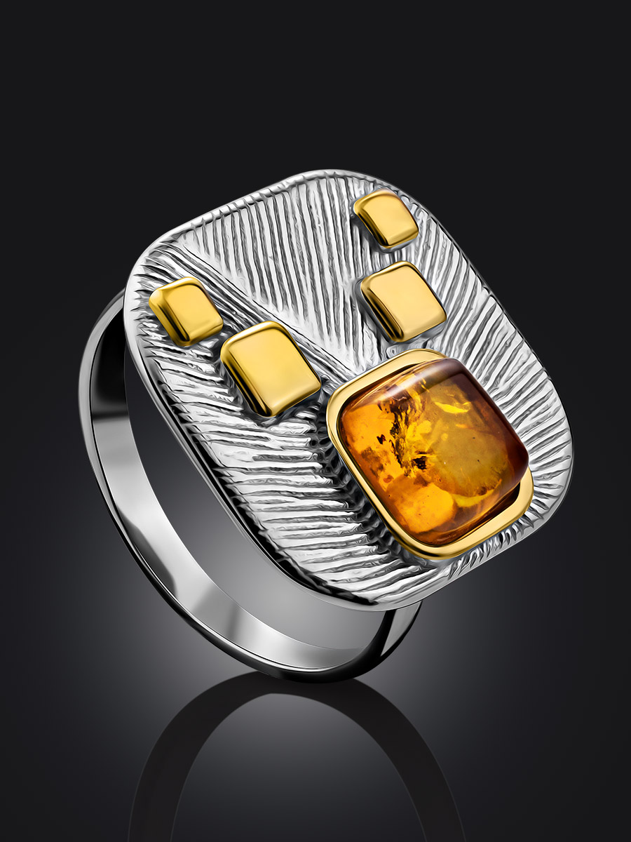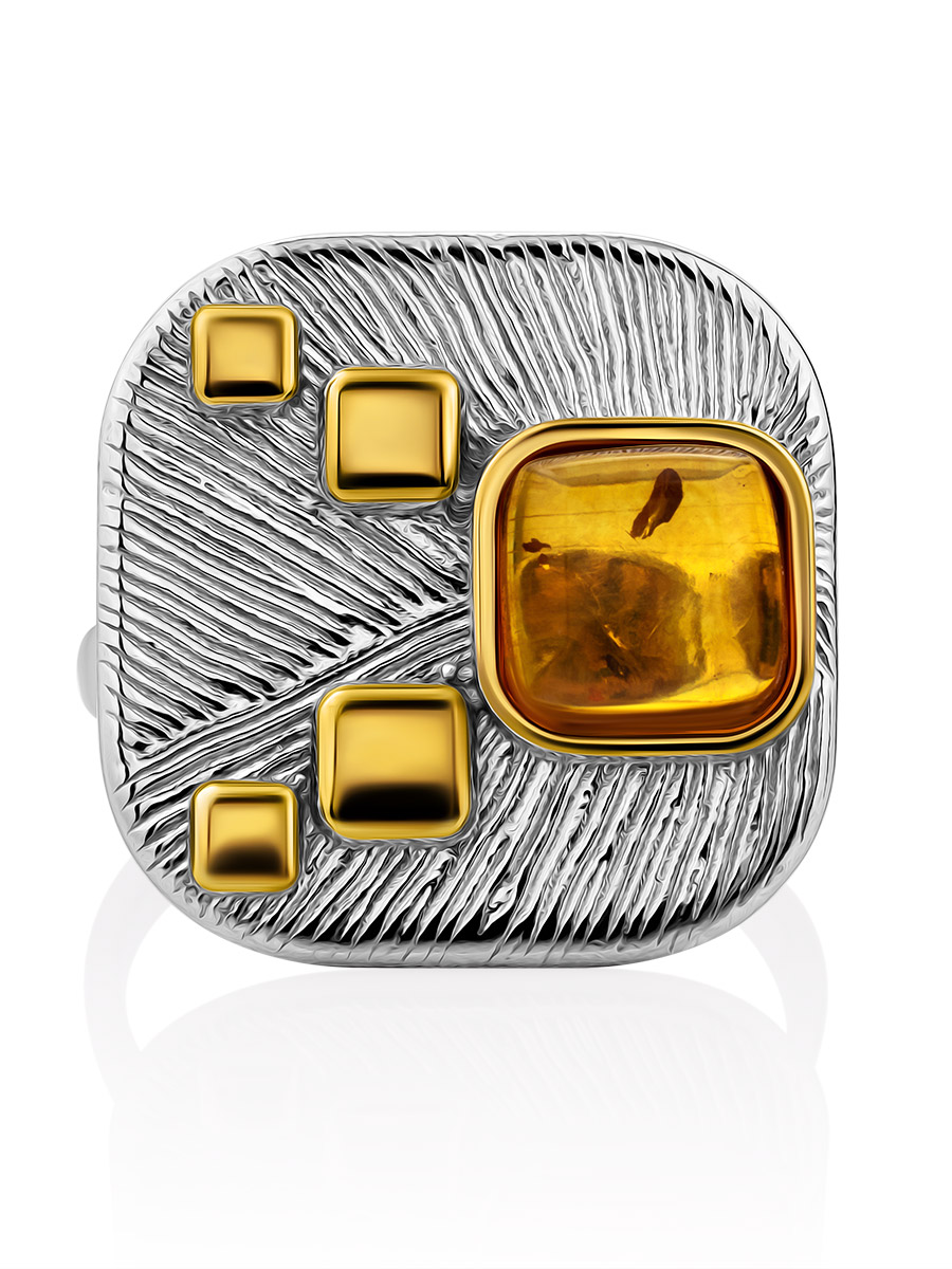 Стильное квадратное кольцо из серебра с натуральным янтарём «Донателла»