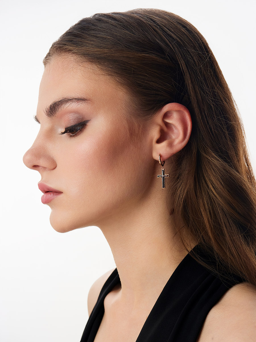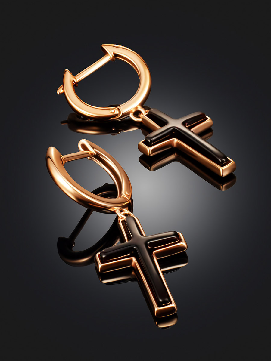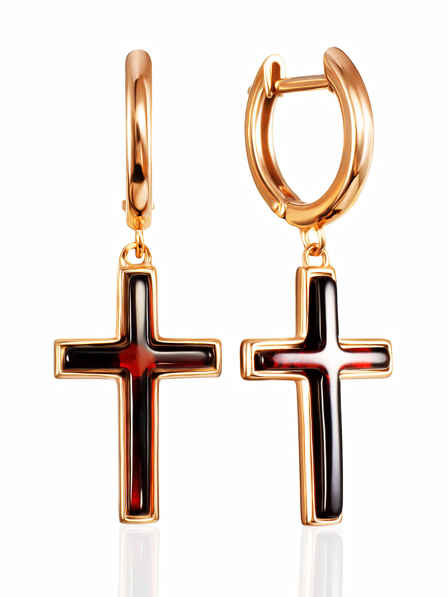 Стильные позолоченные серьги London с крестами из вишнёвого янтаря