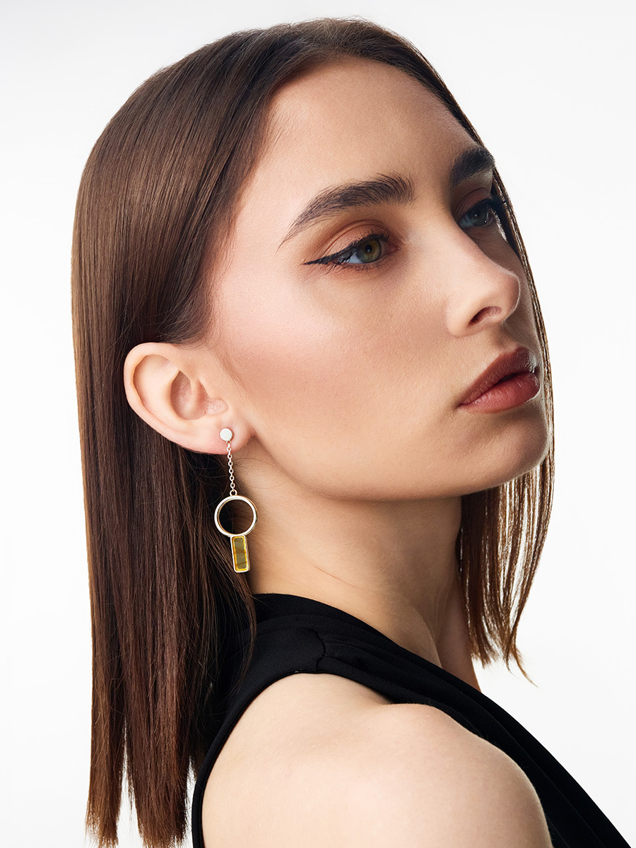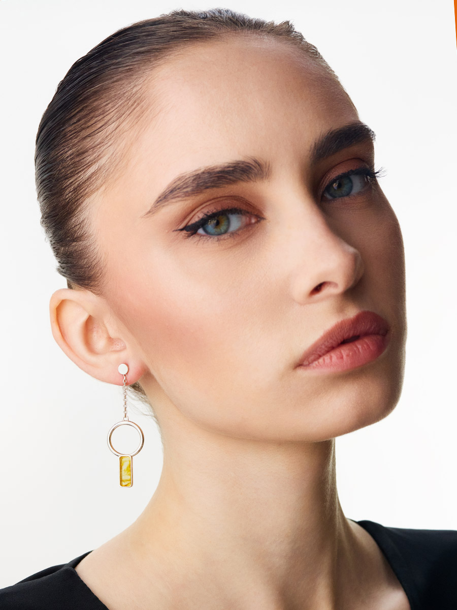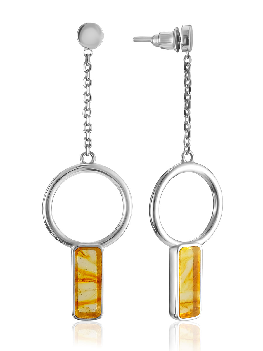Стильные удлинённые серьги-гвоздики с лимонным янтарём London