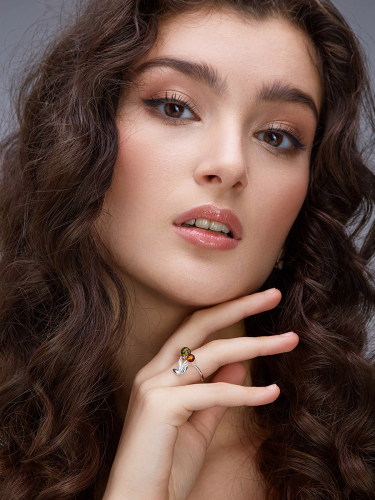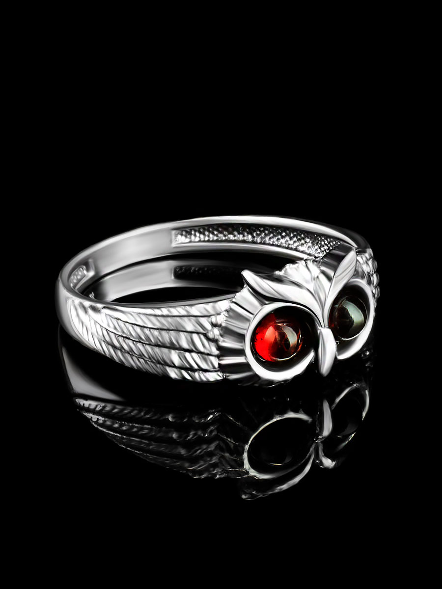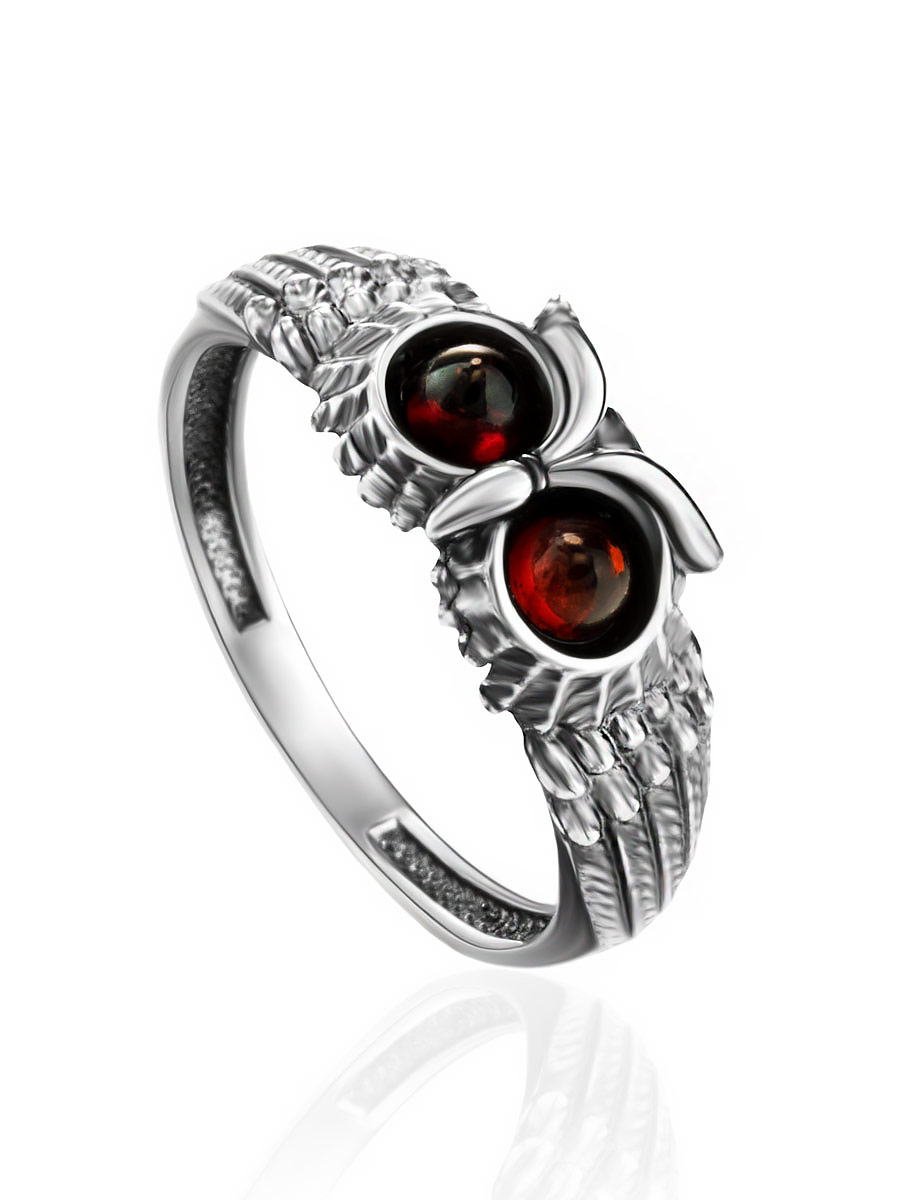 Тонкое необычное кольцо, украшенное вишнёвым янтарём «Филин»