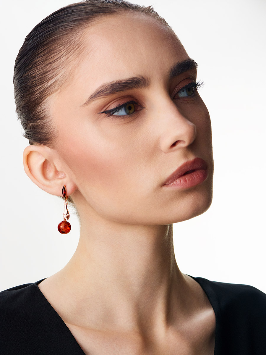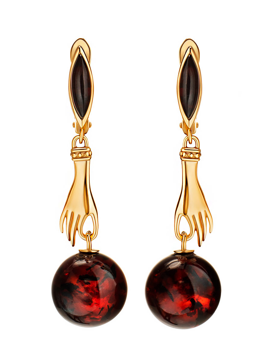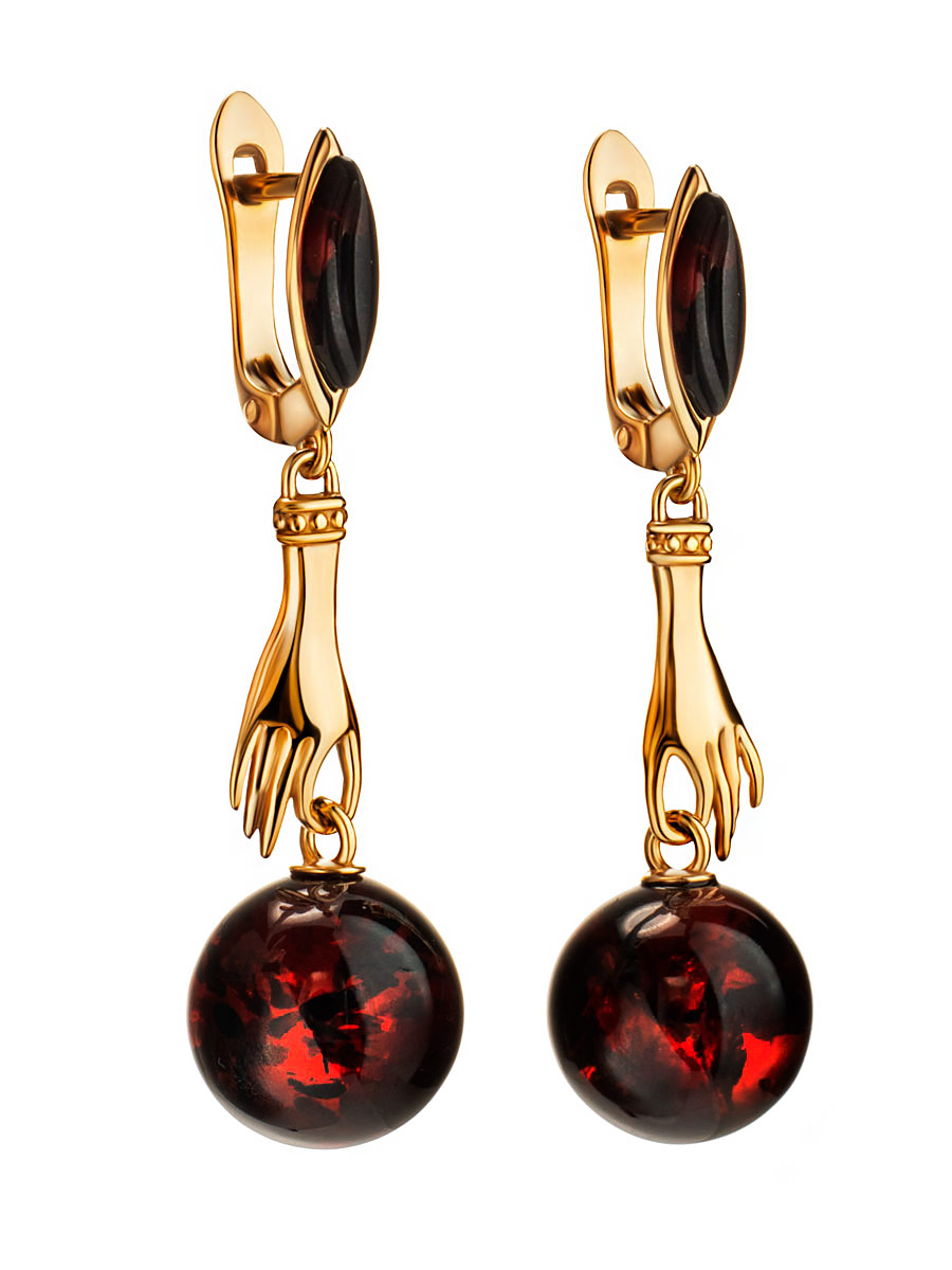 Удлинённые серьги «Объятия» с натуральным тёмно-коньячным янтарём