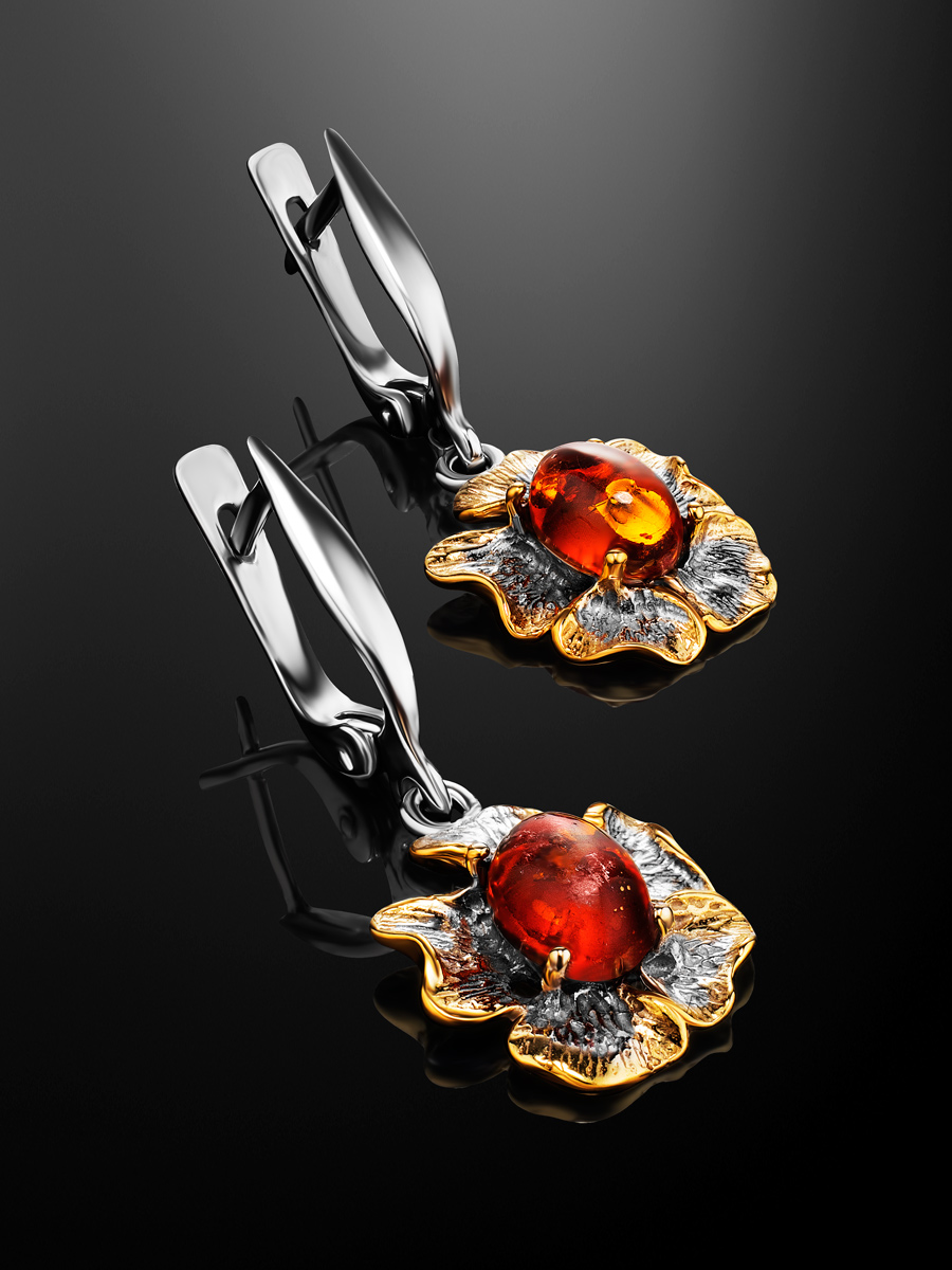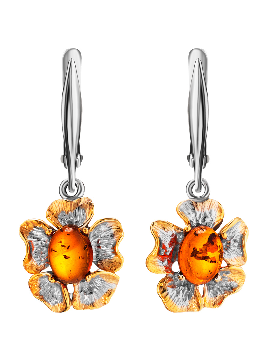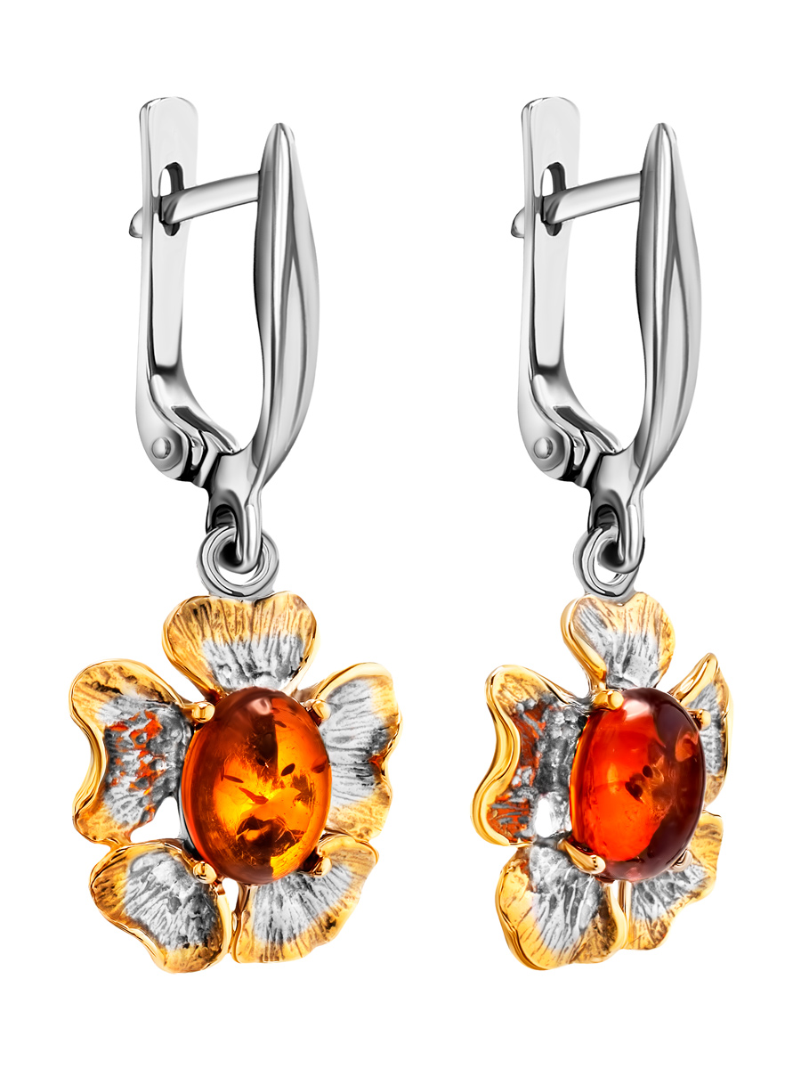 Удлинённые серьги в цветочном дизайне «Бальзамин» с янтарём