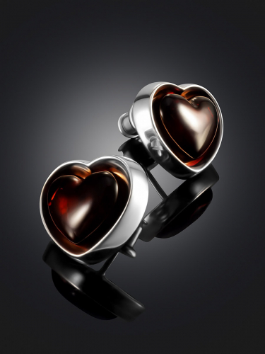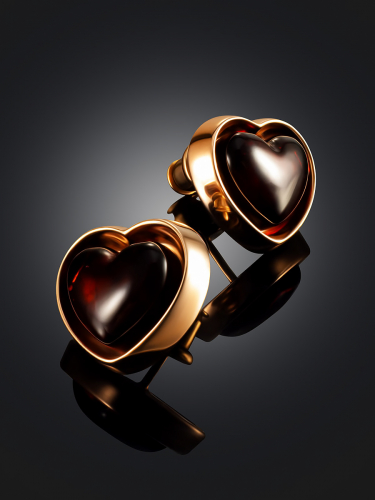 Яркие позолоченные серьги с натуральным вишнёвым янтарём «Янтарное сердце»