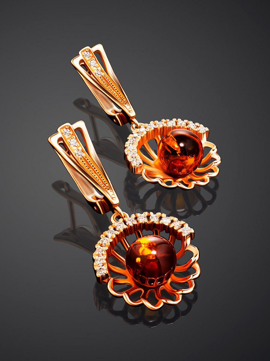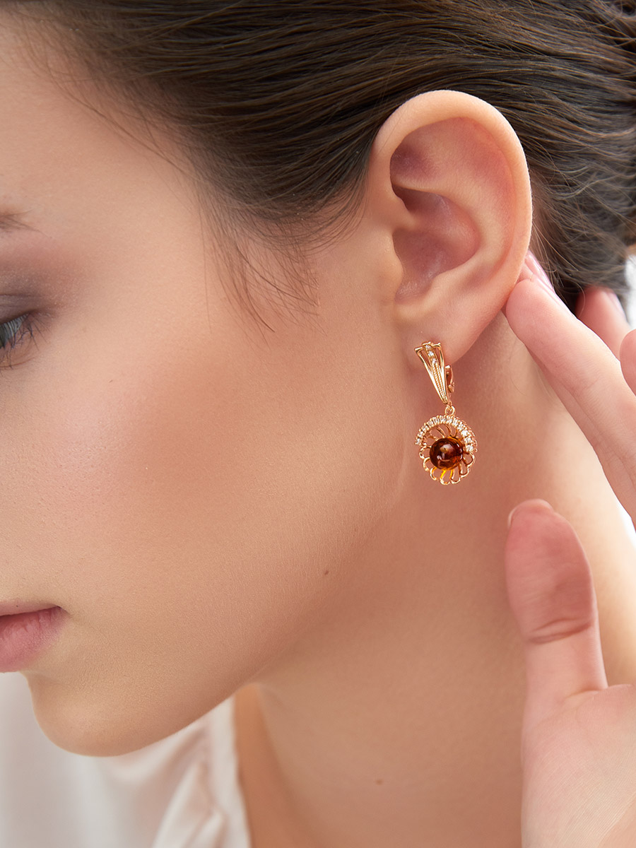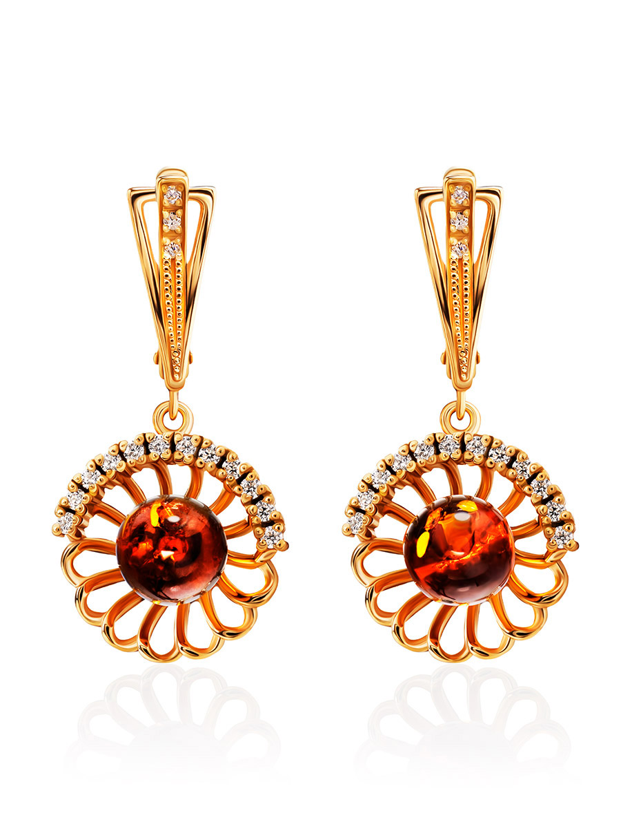 Яркие серьги с натуральным янтарём и фианитами «Ромашка»