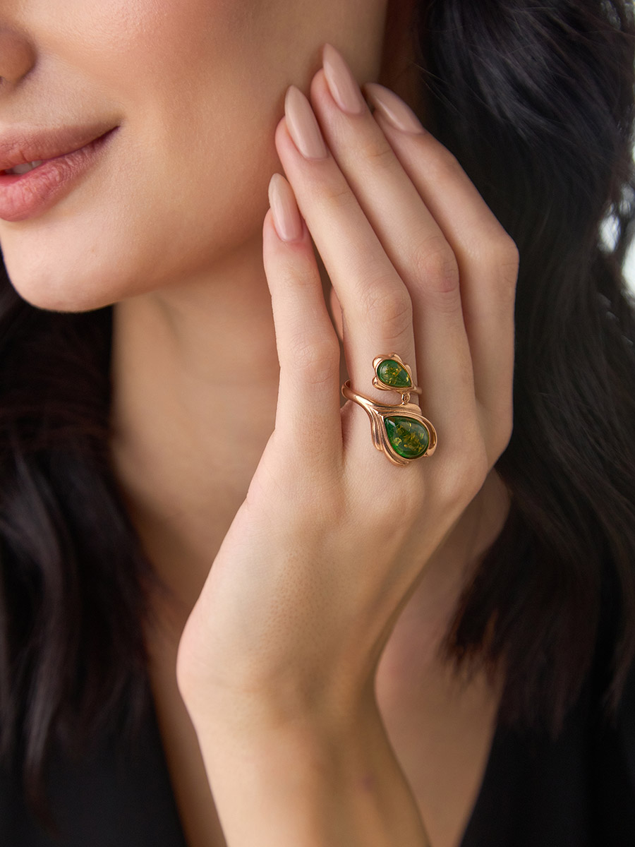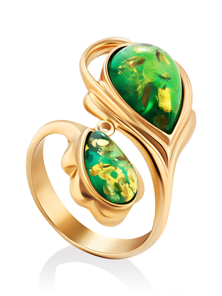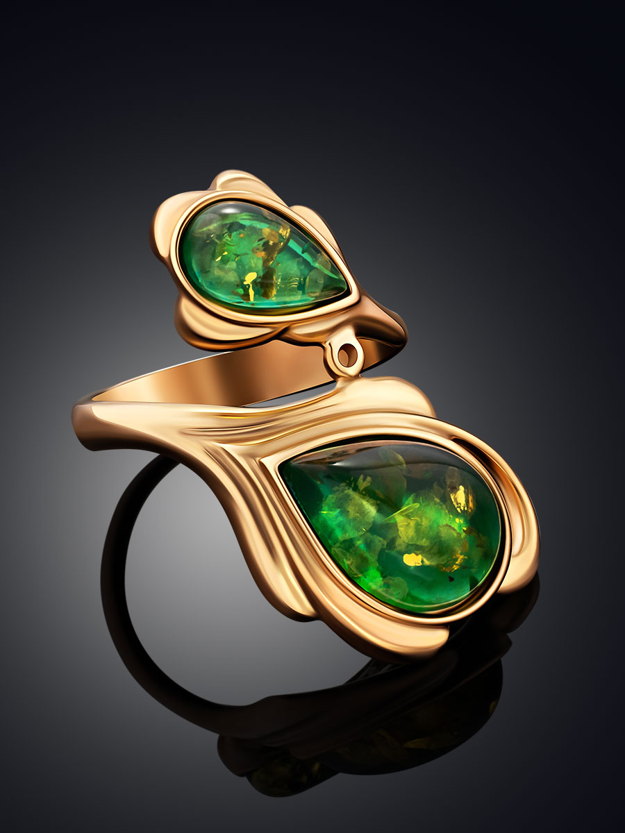 Яркое эффектное кольцо «Павлин» из янтаря зелёного цвета