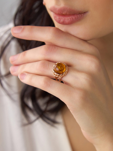 Яркое кольцо в классическом дизайне «Византия» из коньячного янтаря