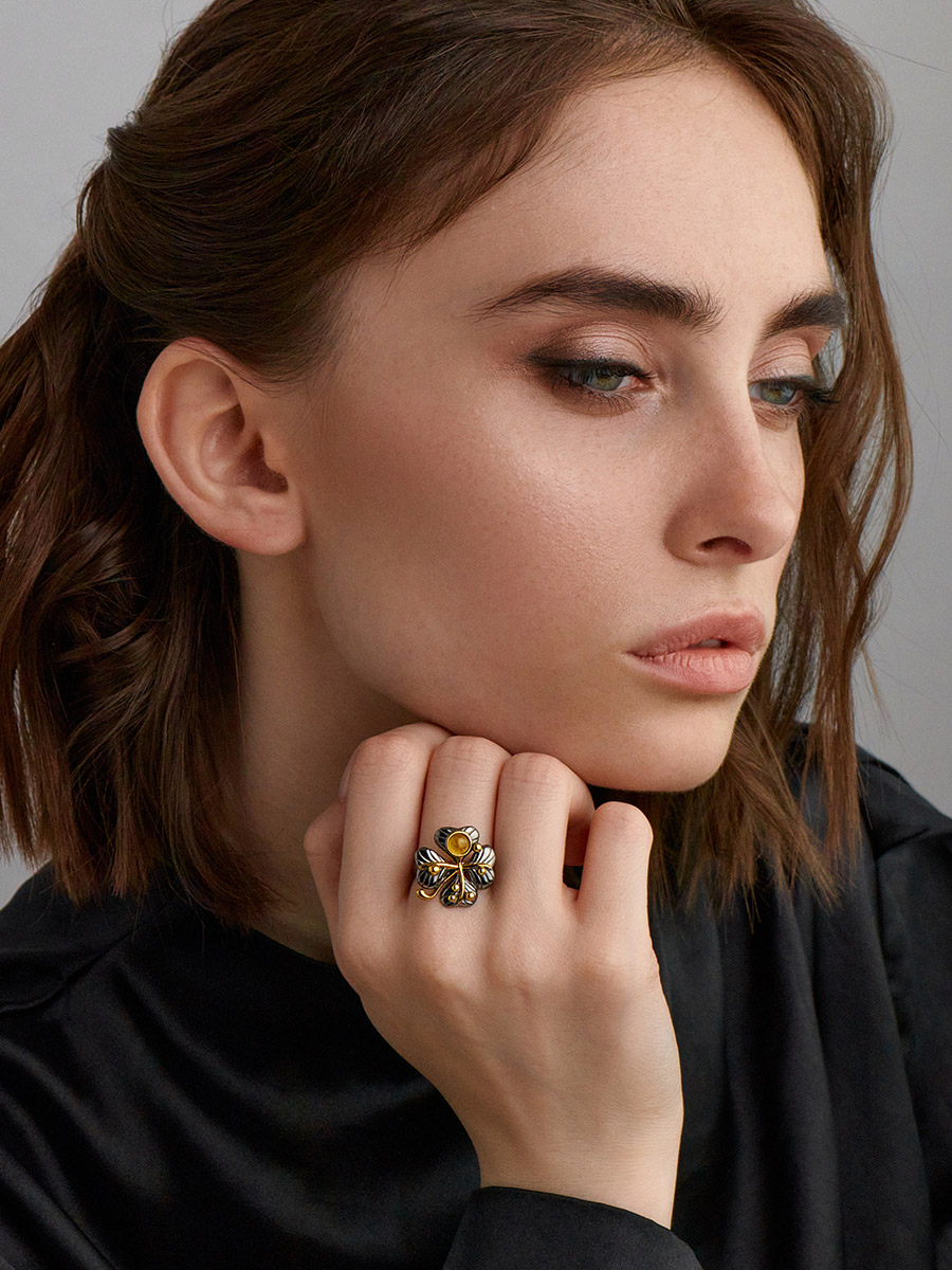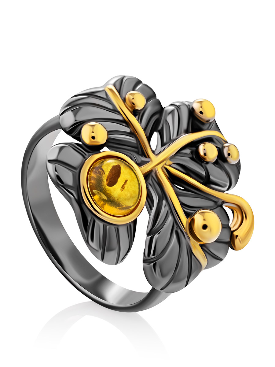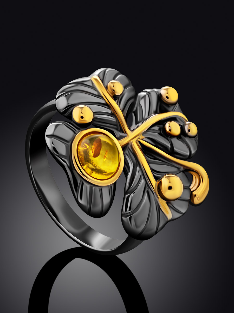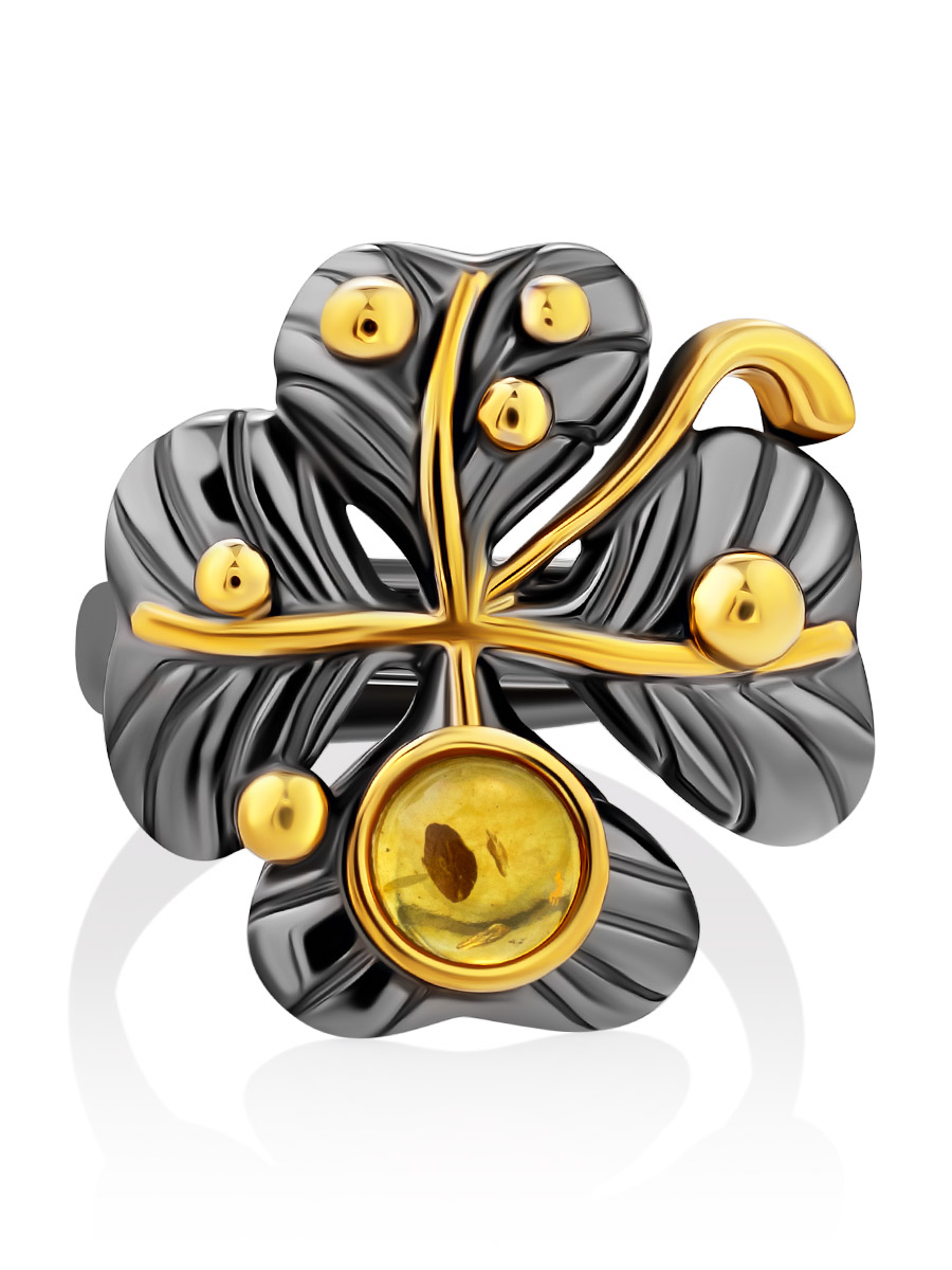 Яркое красивое кольцо «Клевер» из золотистого янтаря