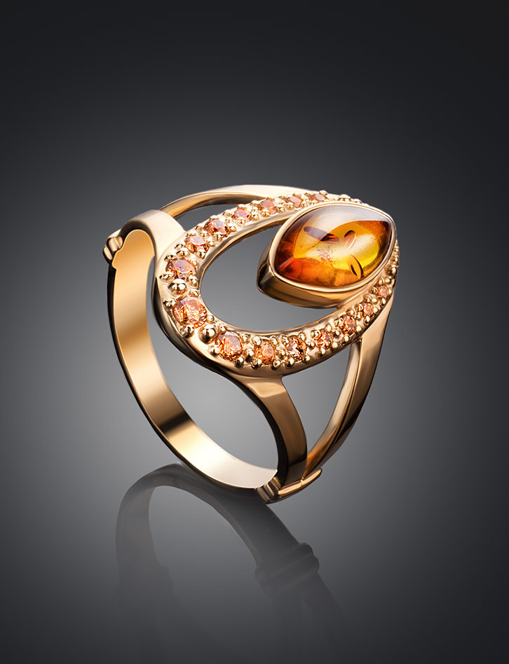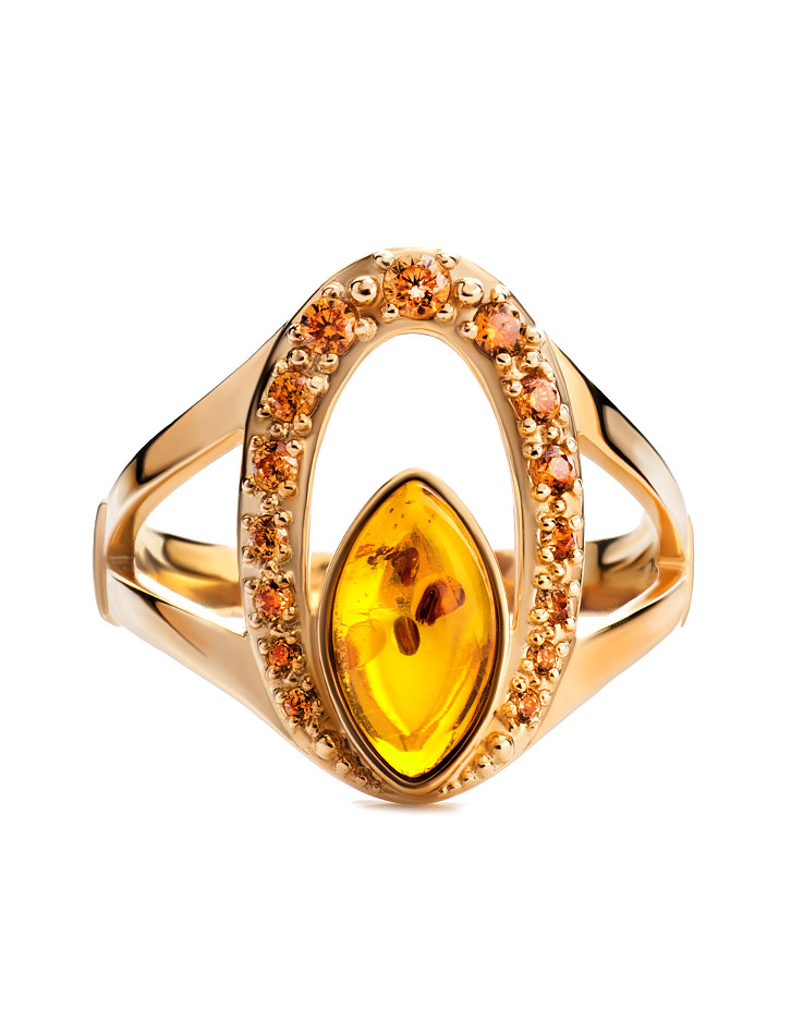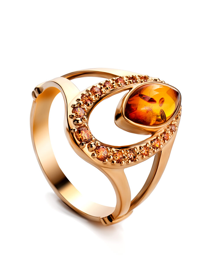 Яркое позолоченное кольцо с коньячным янтарём и цирконитами «Ренессанс»
