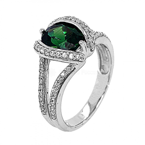 Кольцо из серебра с пл.зелёным кварцем и фианитами родированное 925 пробы КН-0026