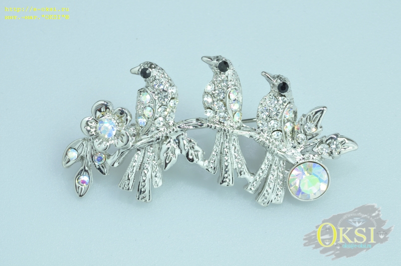 Брошь «Соловушки» из кристаллов, на серебряном фоне. Размер 2,8 см. х 5,5 см.