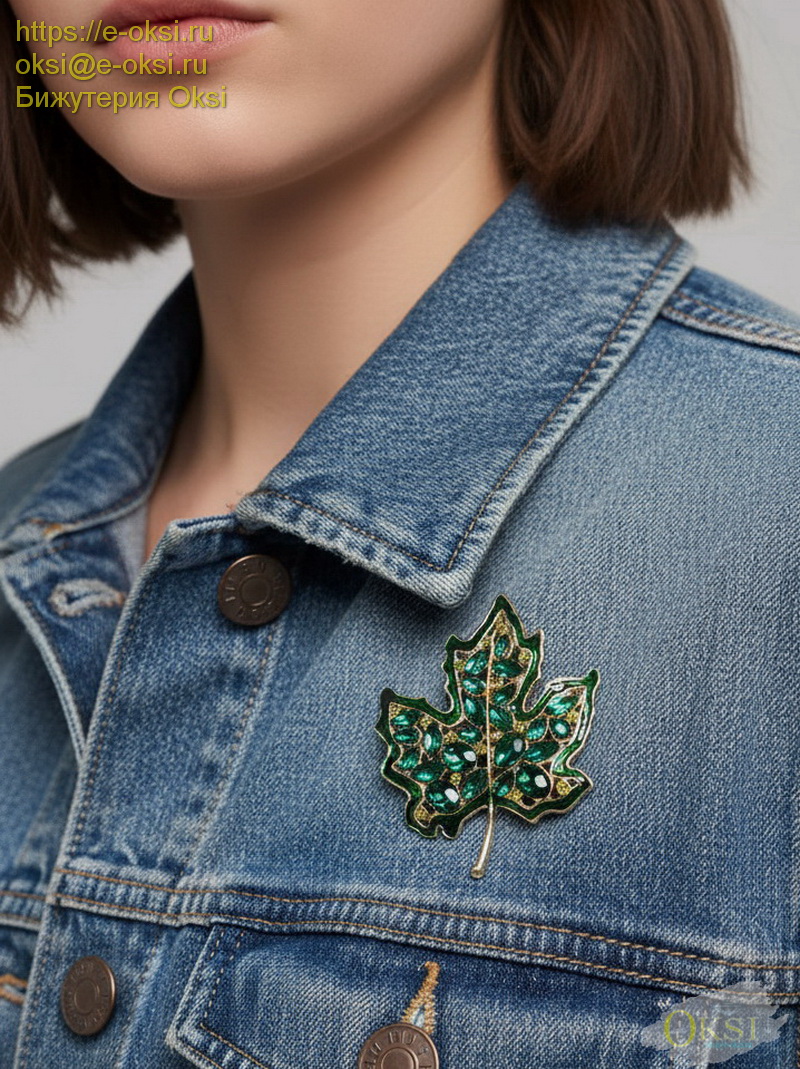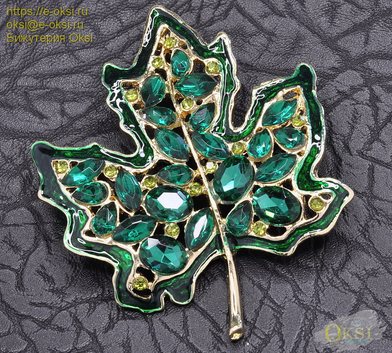 Эффектная, крупная брошь - кулон '' Лист '' с изумрудными, сверкающими кристаллами. Украшение '' два в одном'' можно использовать как брошь, и как кулон ( с изнаночной стороны есть петля для цепочки или шнурка). Цепочку или шнурок можно подобрать в разделе '' Шнурки, цепочки ''. Качественное гальваническое покрытие золотого цвета. Размер броши 6.5 см х 5 см.