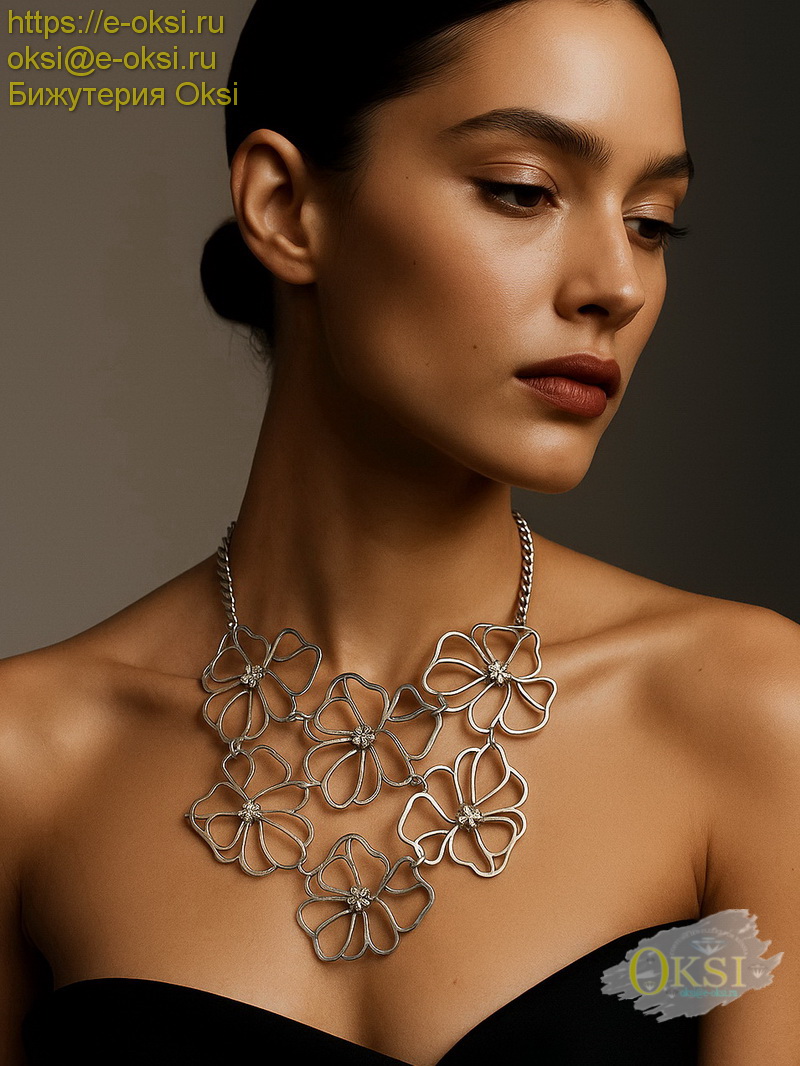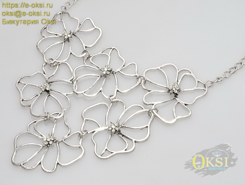 Ажурное колье в форме цветов украшено сверкающими кристаллами. Качественное родиевое покрытие серебристо - серого цвета. Длина колье 45 см + 5 см регулирующая размер цепочка. Серебристо - серый цвет - цвет элегантности и стиля, спокойствия и стабильности. Этот цвет - универсальный и нейтральный сочетается с любыми оттенками одежды и аксессуаров. Серебристо - серый цвет идет абсолютно всем, главное - сыграть на контрасте