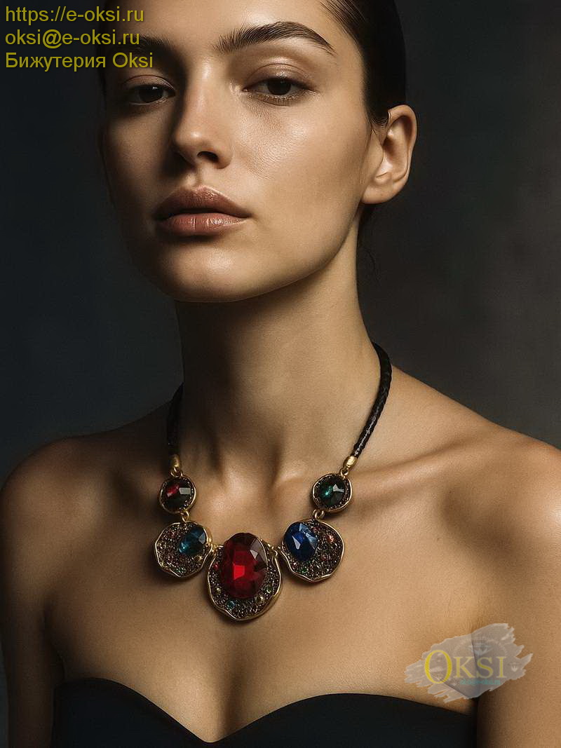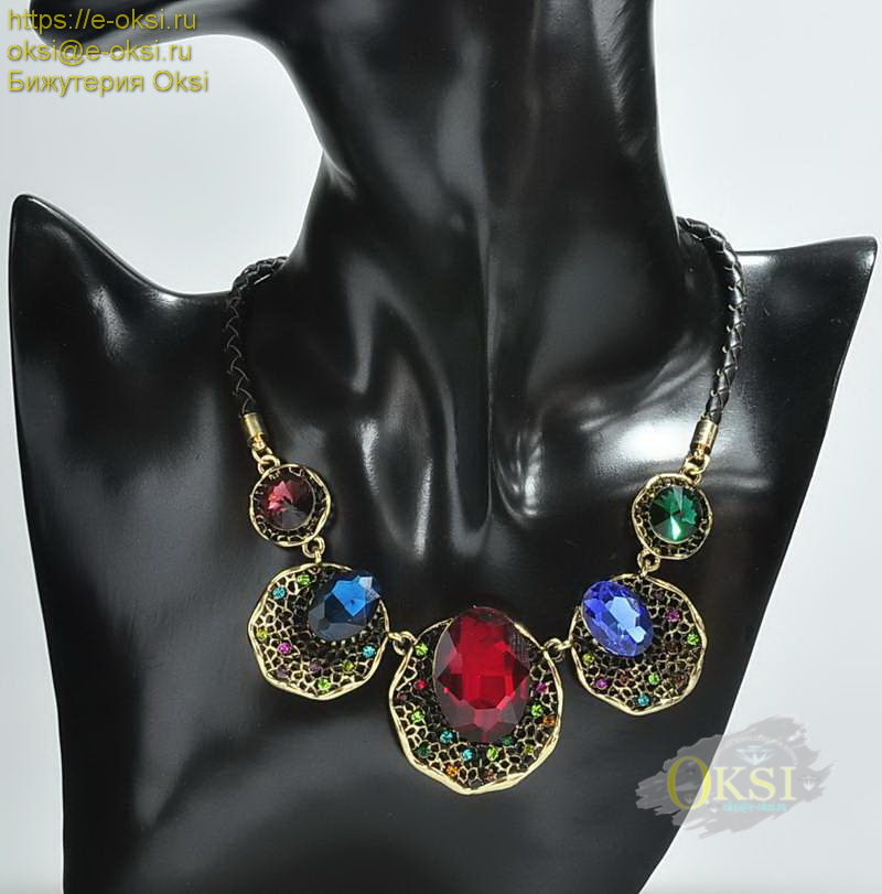 Очень красивое колье с крупными кристаллами разного цвета, подойдет под любой цвет одежды и аксессуаров. Качественное гальваническое покрытие. Колье на бархатных шнурках. Длина 45 см. + 5 см. цепочка