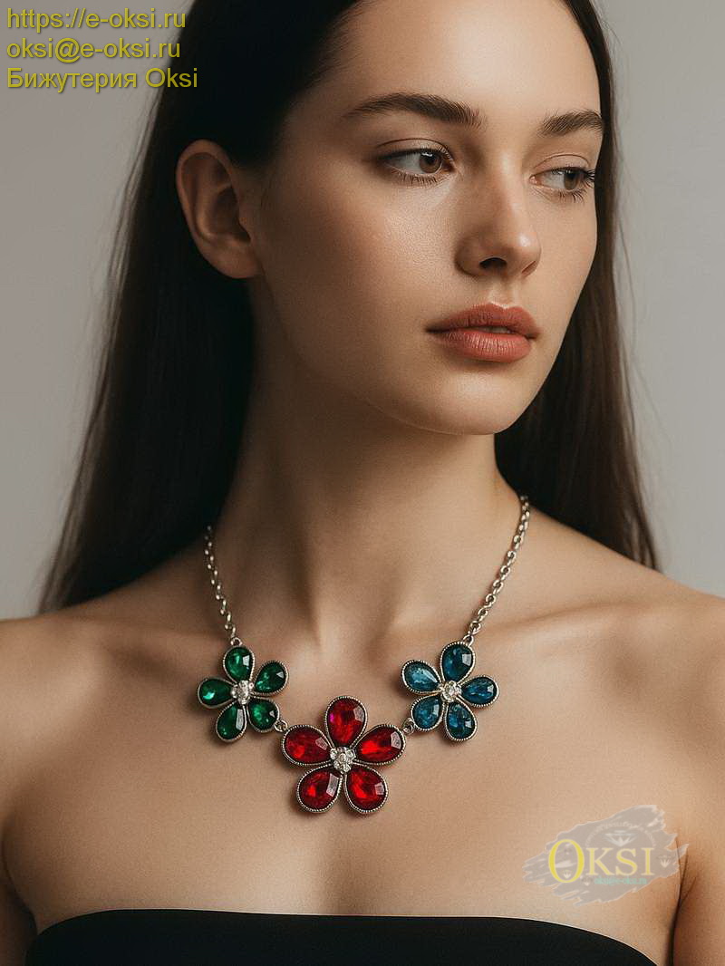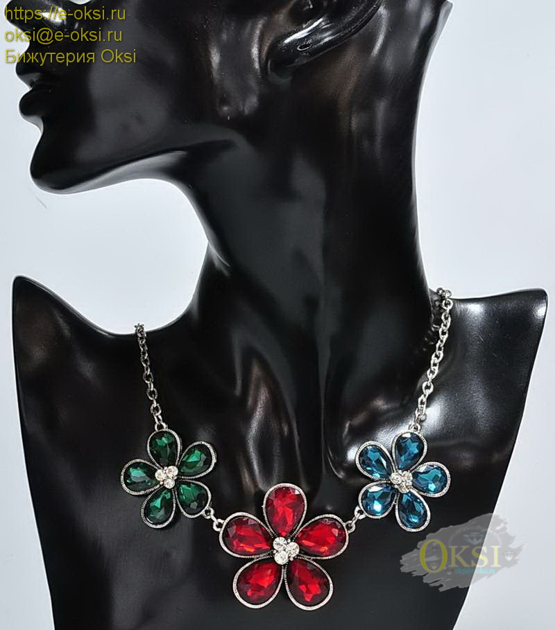 Красивое колье из крупных сверкающих кристаллов , выполнено в форме цветов. Универсальное, подходит к любому цвету одежды и аксессуаров. Качественное родиевое покрытие серебряного цвета. Длина колье 45 см + 7 см регулирующая размер цепочка.