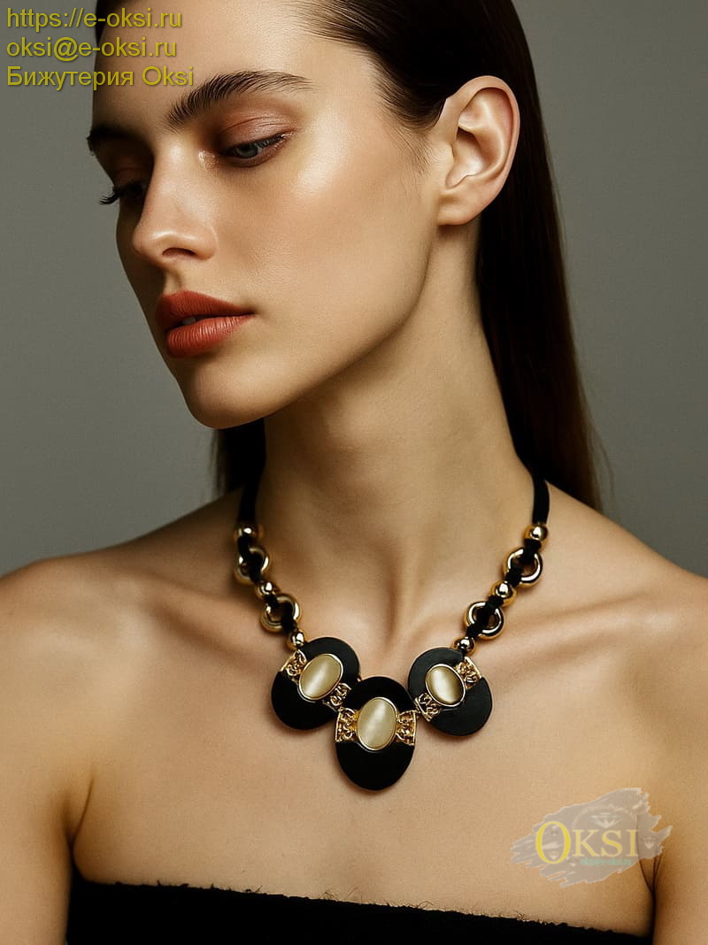 Стильное и очень красивое колье на каждый день, или вечер. Эффектное, всегда безпроигрышное сочетание золотого и черного цвета является универсальным украшением подходящим под любой цвет одежды и аксессуаров. Колье на бархатных шнурках. Длина колье 45 см. +5 см. цепочка