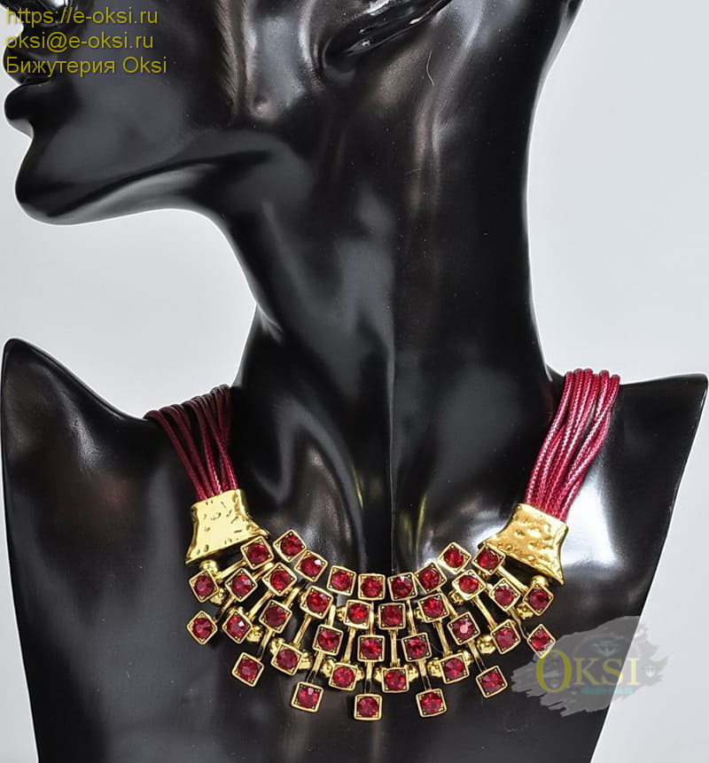 Эффектное, красивое колье украшено сверкающими кристаллами вишневого оттенка. Качественное гальваническое покрытие золотого цвета. Длина колье 45 см .