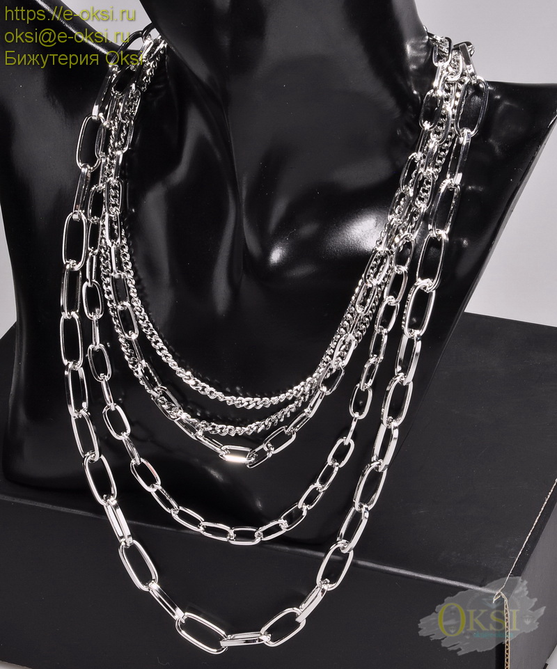 Стильное, многорядное колье серебряного цвета. Качественное родиевое покрытие. За счёт удлиняющей цепочки, длина колье регулируется от 39 см до 45 см.
