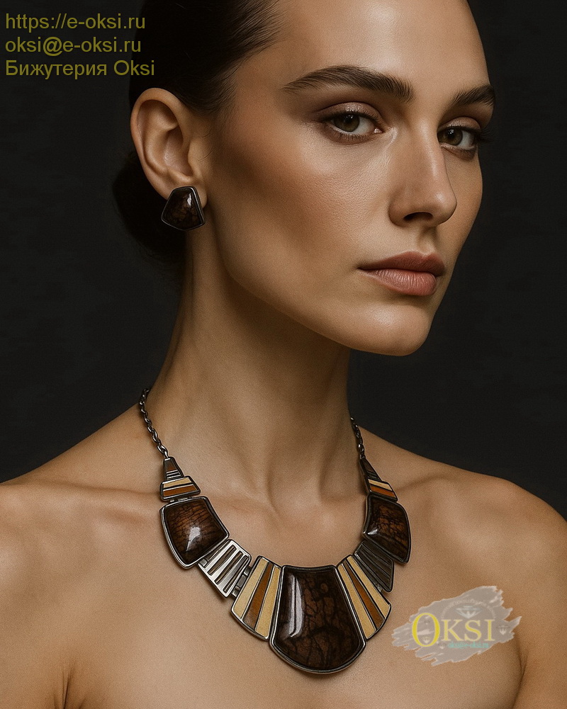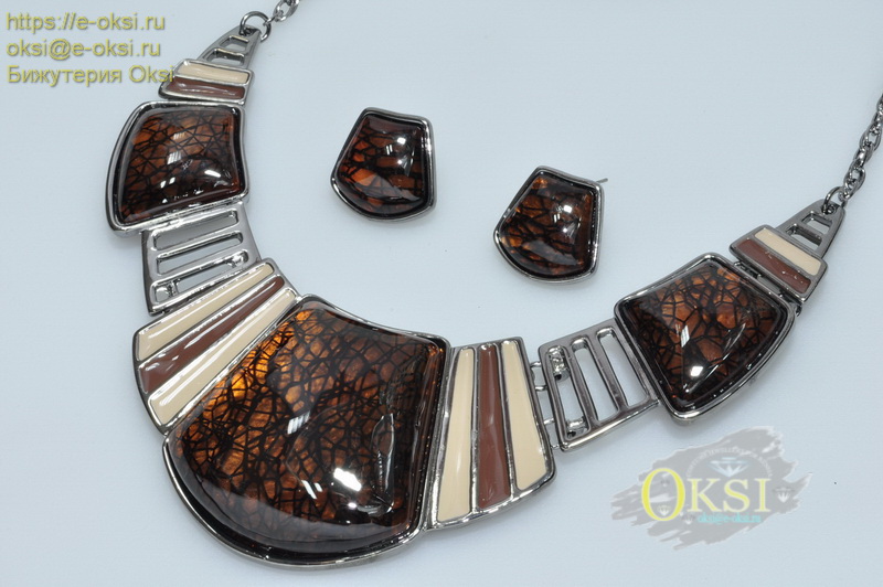 Эффектный комплект с синтетическими вставками удачно подобранных, и отлично сочетающихся коричневых и шоколадно - кремовых оттенков. Качественное гальваническое покрытие серебряного цвета. Длина колье 43 см + 7 см регулирующая размер цепочка.