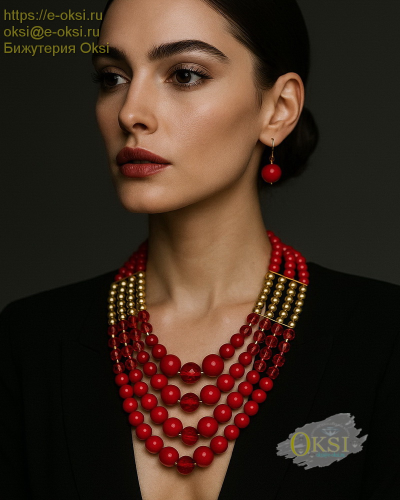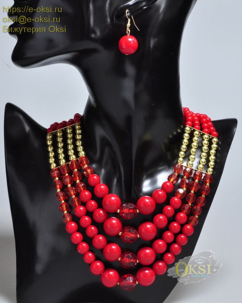 Яркий, лёгкий, эффектный комплект из акрила и хрустальных бусин. Красный цвет - цвет красоты и женственности, роскоши и статуса, гармонии и вкуса. Украшения красного цвета выбирают яркие и целеустремленные, успешные и уверенные. Красный может как контрастировать, так и сочетаться с основным цветом одежды или аксессуаров. Длина колье 45 см + 5 см удлиняющая цепочка.
