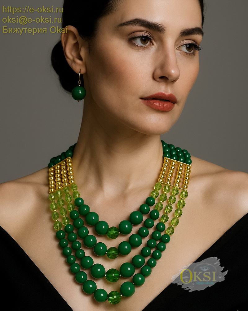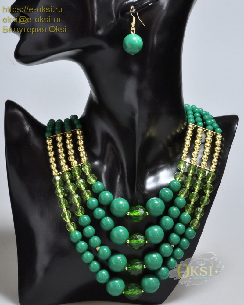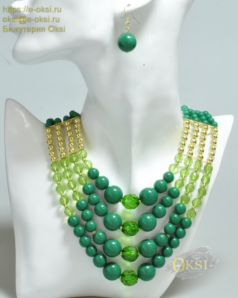 Яркий, эффектный очень лёгкий комплект из яркого изумрудного акрила и хрустальных бусин.Зеленого много не бывает. Особенно, если его оттенки удачно подобраны и идеально сочетаются. Акцентировать внимание на зеленом можно с помощью нейтрального фона. Лучший контраст создает универсальные белый, серый и черный. Очень красивые и яркие сочетания с оранжевым и желтым, а также с золотым и серебряным оттенками одежды и аксессуаров..Длина колье 45 см + 5 см регулирующая размер цепочка.